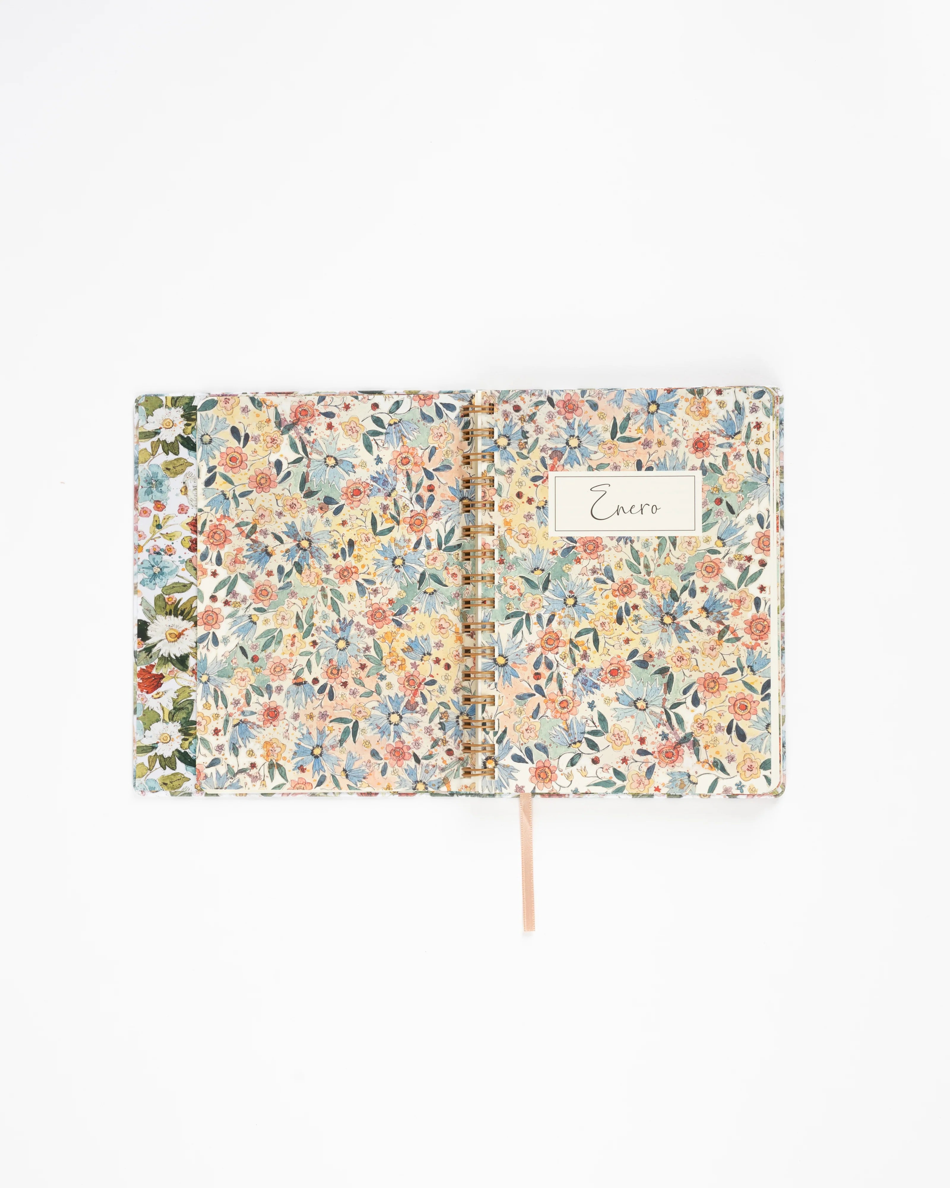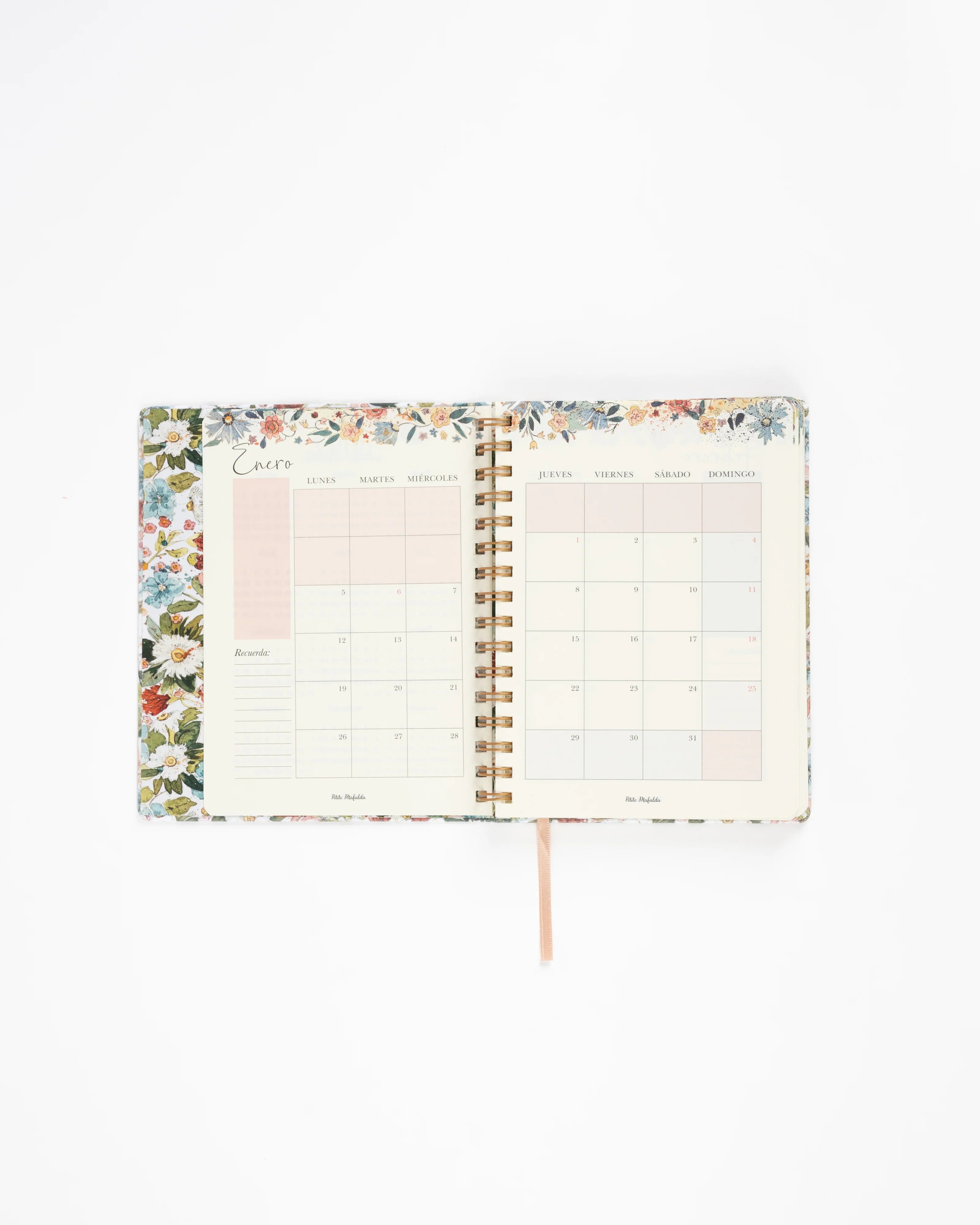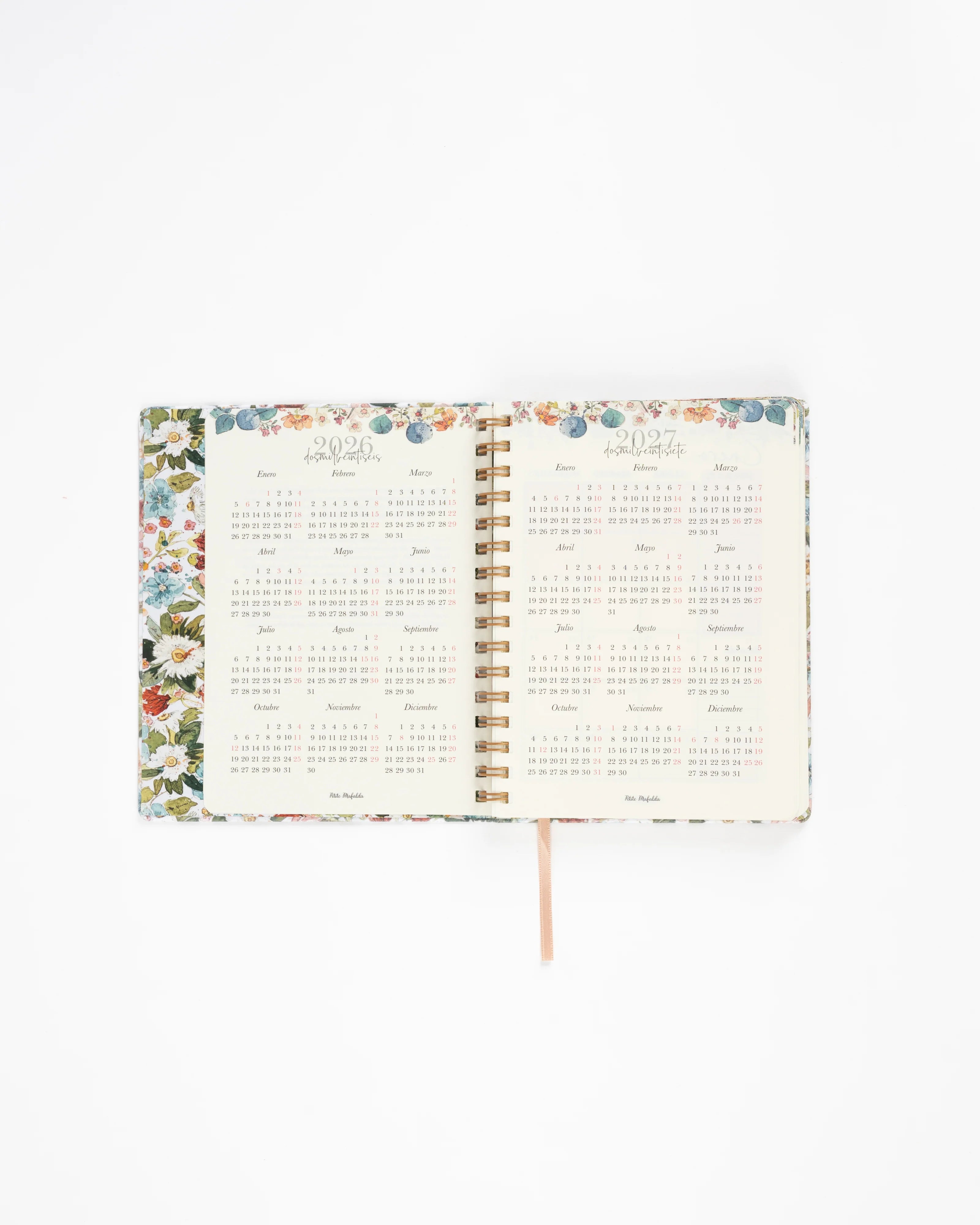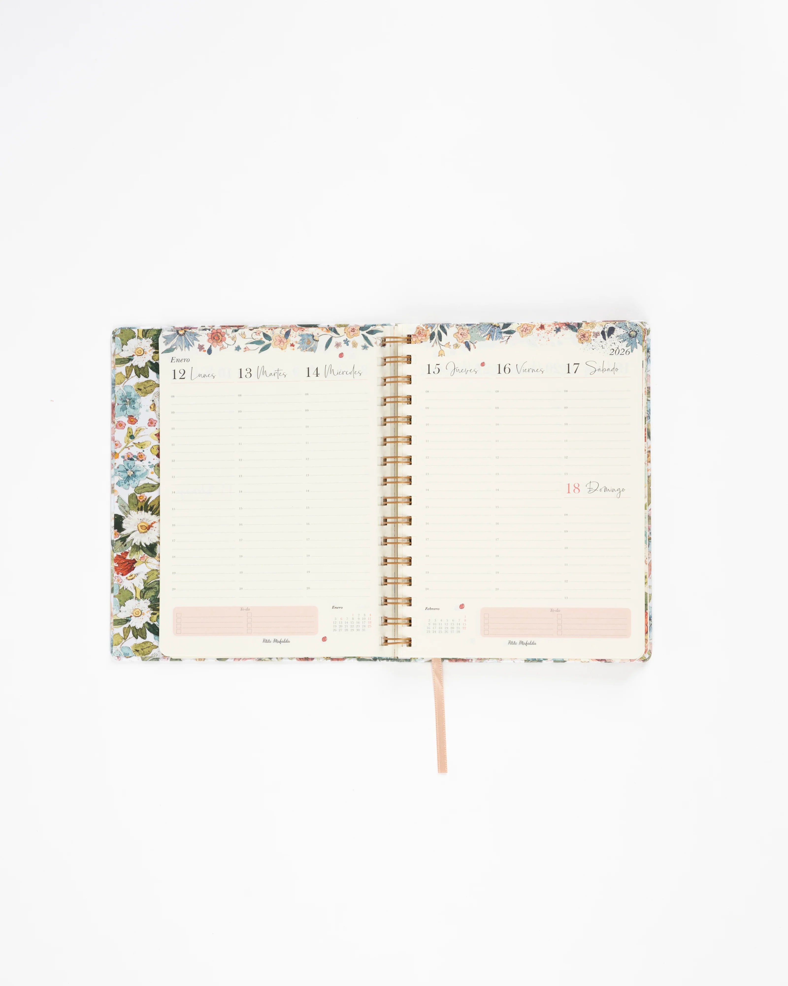 Su diseño interior presenta un calendario día por página 2026/2027 a doble página con todos los meses del año, que incluye los principales festivos y frases “petite” repartidas por toda la agenda, así como un estampado de flores para cada mes.