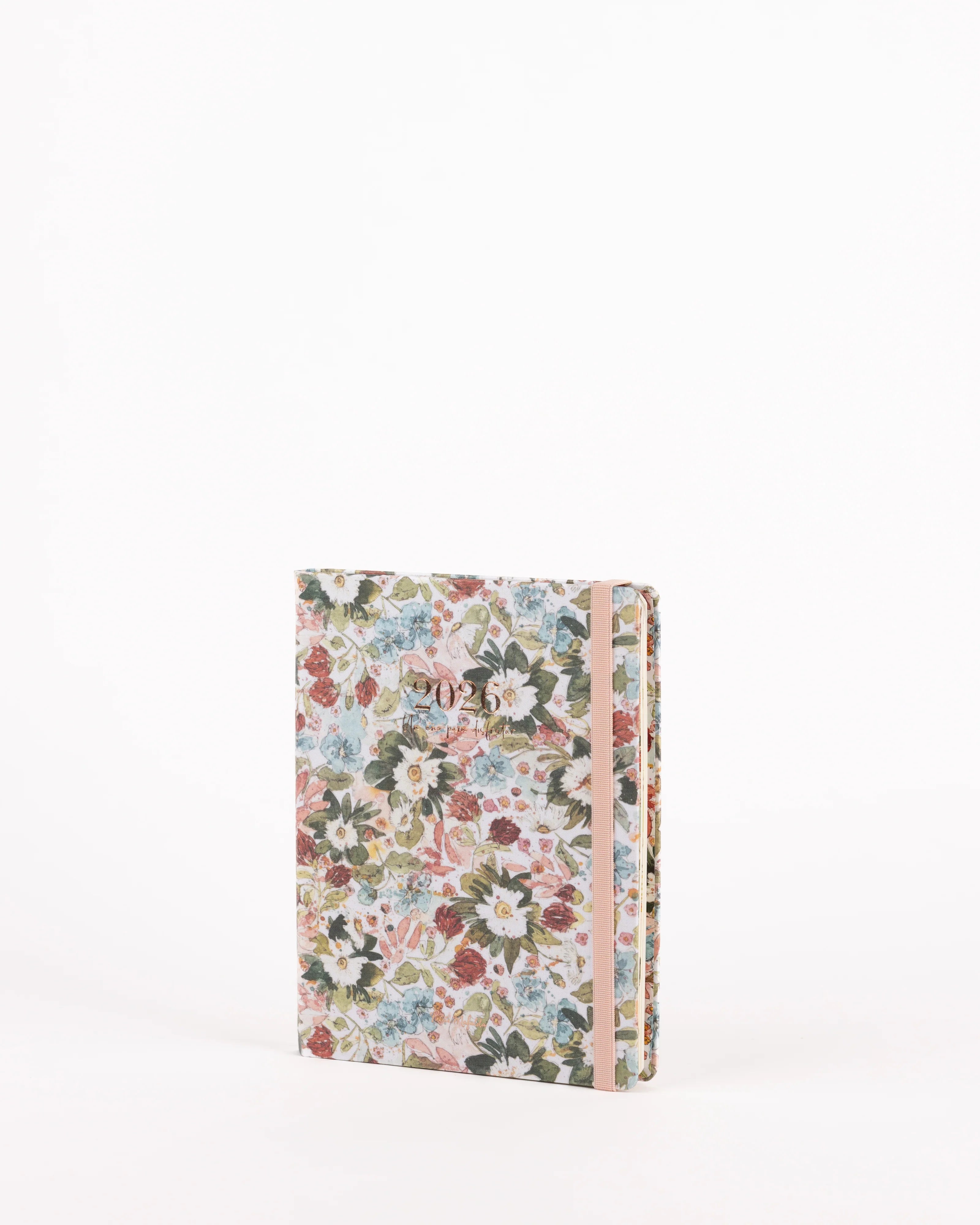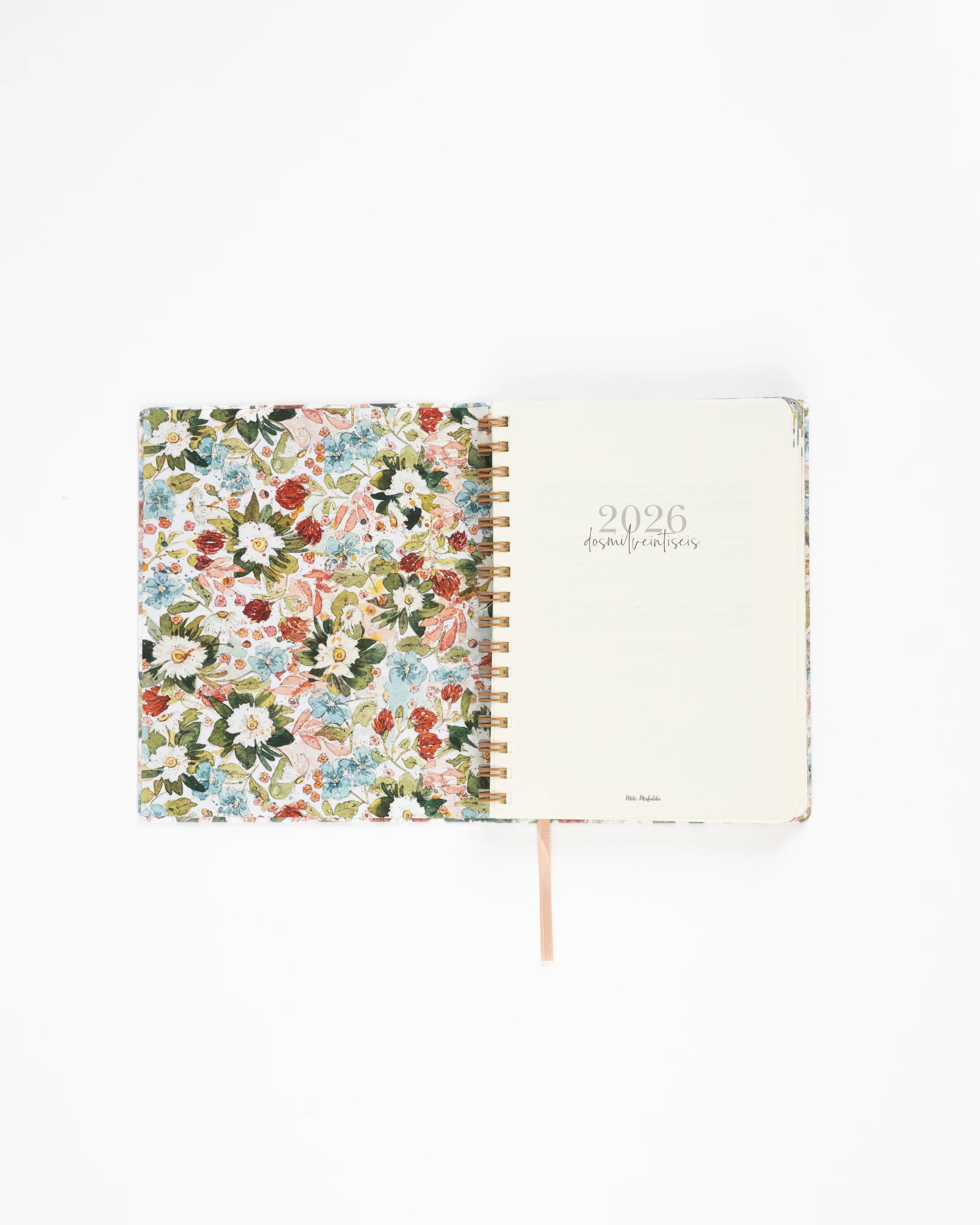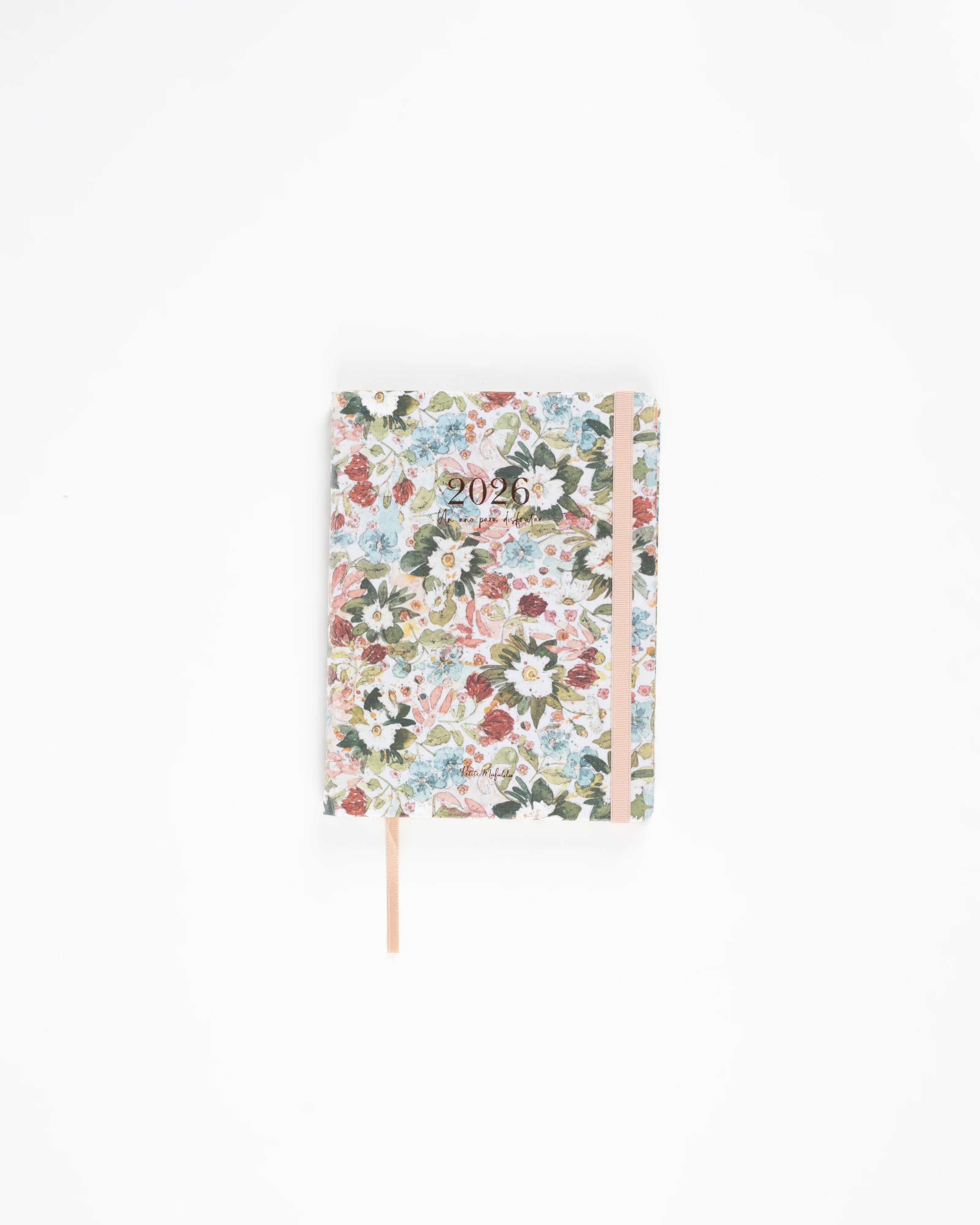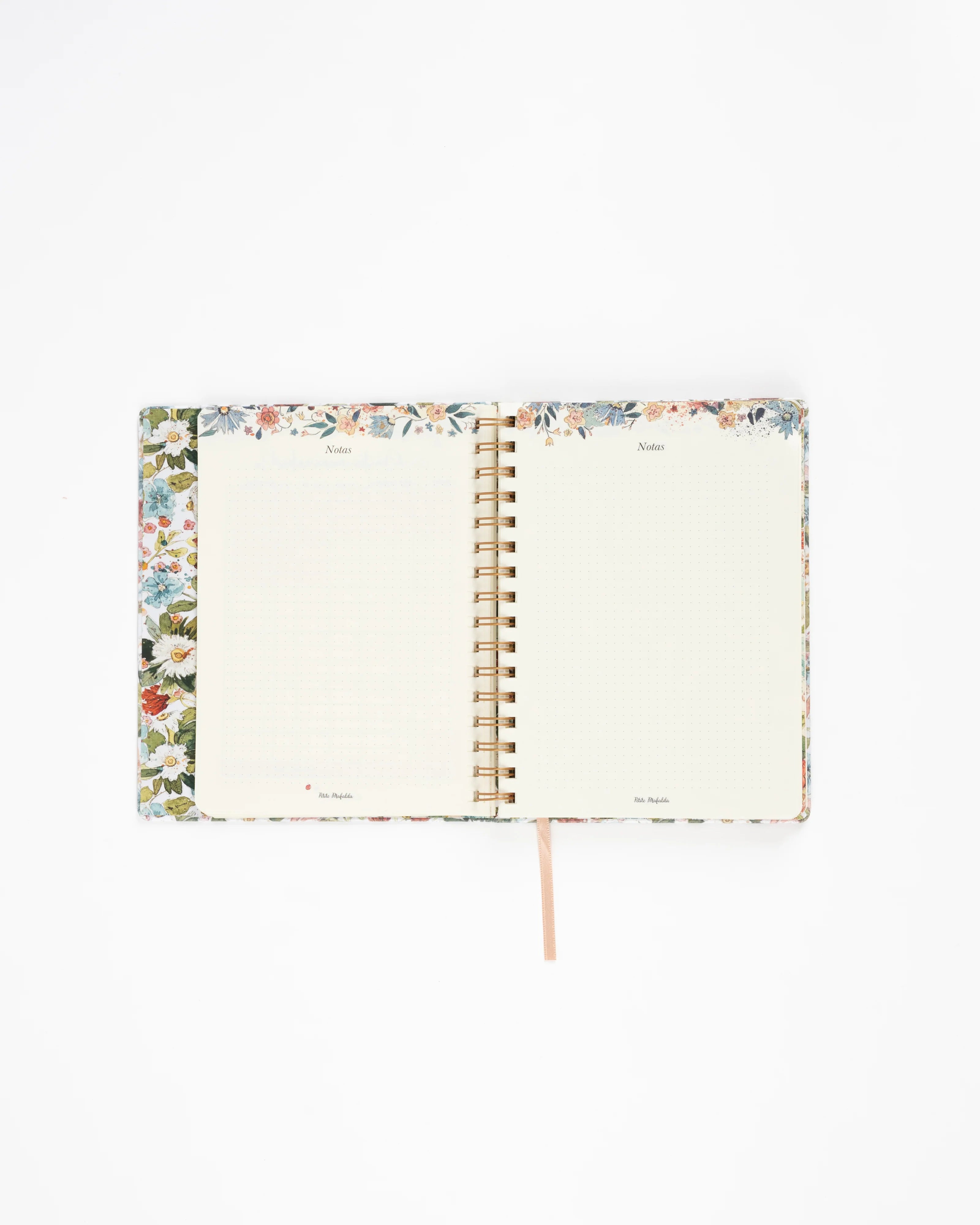Su diseño interior presenta un calendario día por página 2026/2027 a doble página con todos los meses del año, que incluye los principales festivos y frases “petite” repartidas por toda la agenda, así como un estampado de flores para cada mes.