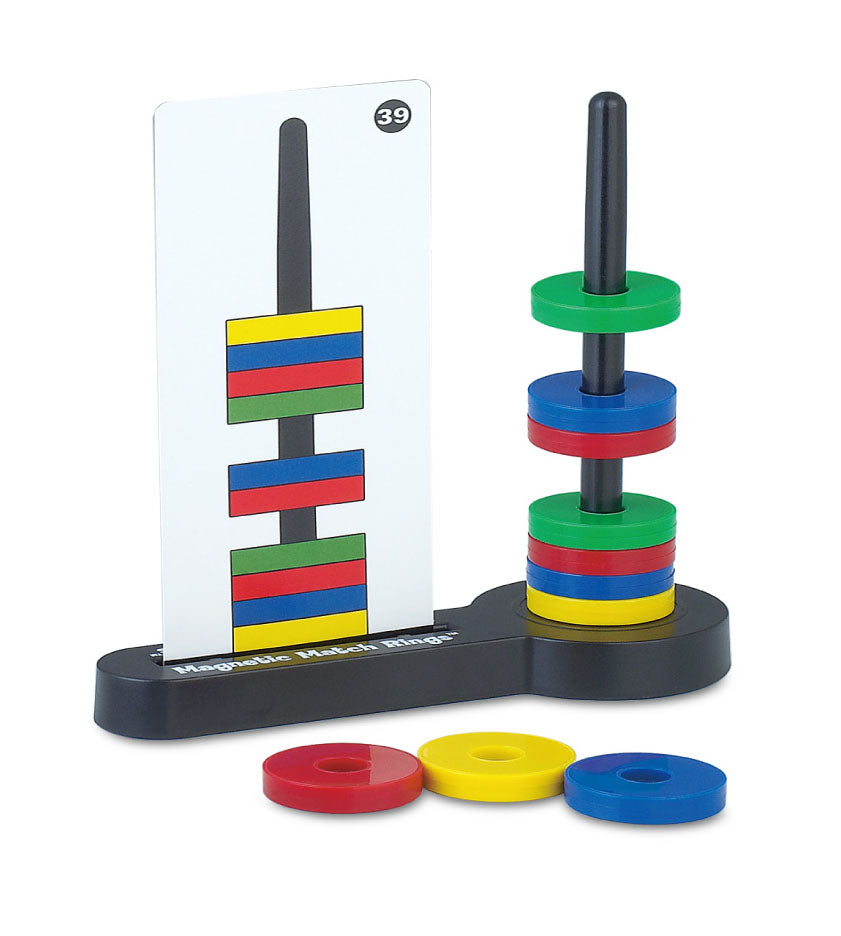 Para jugar: selecciona uno de los 50 desafíos de combinación de patrones y apila los anillos magnéticos exactamente en el mismo orden de color que se muestra en la tarjeta. Si una tarjeta muestra anillos que están flotando (sin tocarse), sus anillos también deben estar flotando. ¡Diviértete combinando!