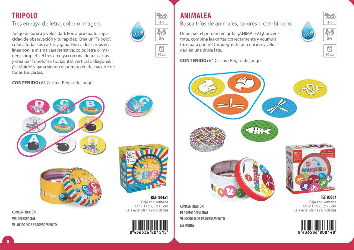 Debes ser el primero en gritar ¡ANIMALEA! ¡Concéntrate, combina las cartas correctamente y acumula tríos para ganar! Dos juegos de percepción y velocidad en una única lata.