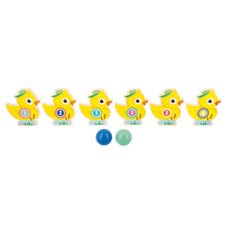 ¡Empieza la batalla de los patos! ¿Quién será el más habilidoso que conseguirá derribar la mayor cantidad de patos con las 2 bolas de madera? Este juego de bolos de madera, con forma de patos, numerados del 1 al 6, es ideal para divertir a toda la familia. Desarrolla la coordinación mano-ojo de los más pequeños. Juego de habilidad de madera FSCTM para niños a partir de 3 años. Para 1 o más jugadores.