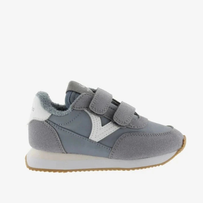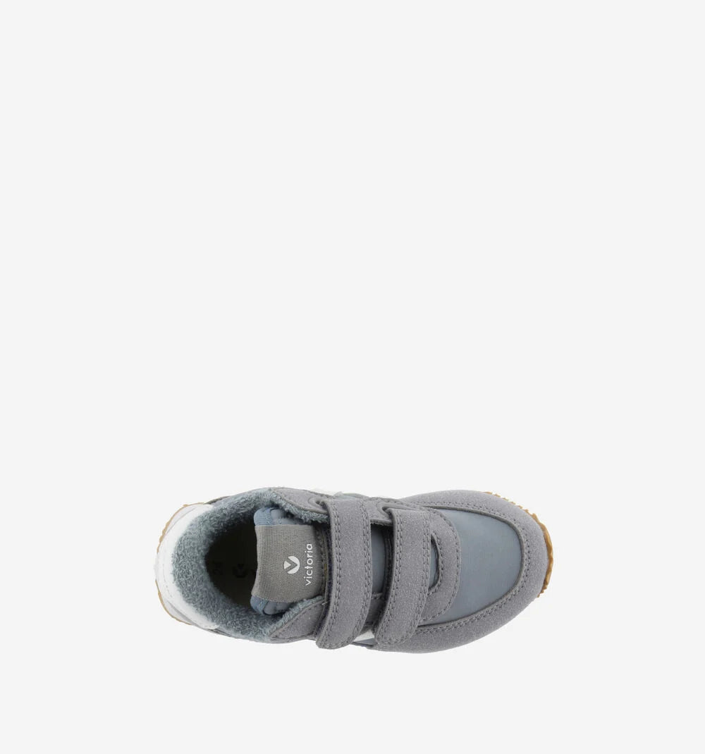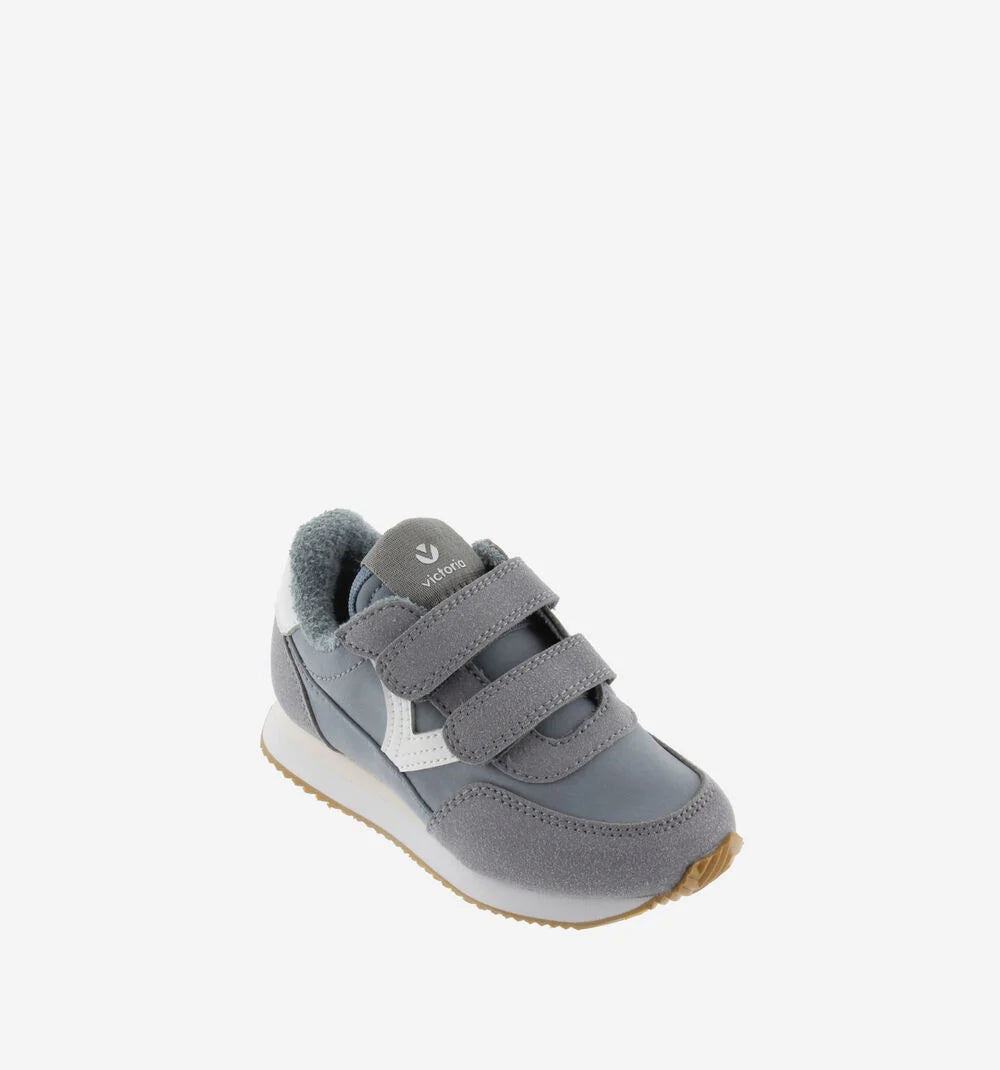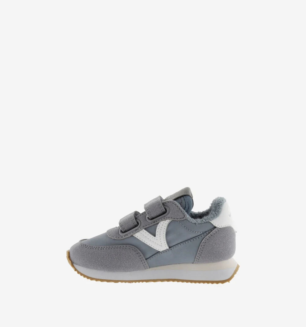 Zapatillas deportivas para niños fabricadas en nailon con piezas efecto serraje al tono. V retro en el lateral y trasera en blanco. Cierre mediante doble tira adherente que fomenta la autonomía y facilita el calce de los más pequeños. Ligeras y cómodas gracias a la suela dentada antideslizante.