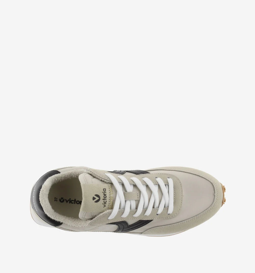 Sneakers beige fabricadas en nailon y piezas efecto serraje y efecto piel. Detalle negro en la trasera con el logotipo de Victoria grabado y V retro en el lateral al tono. Suela con grabados del logotipo en relieve y antideslizante que favorece un mejor agarre. Incluyen plantilla extraíble. Destacan por su comodidad y ligereza.