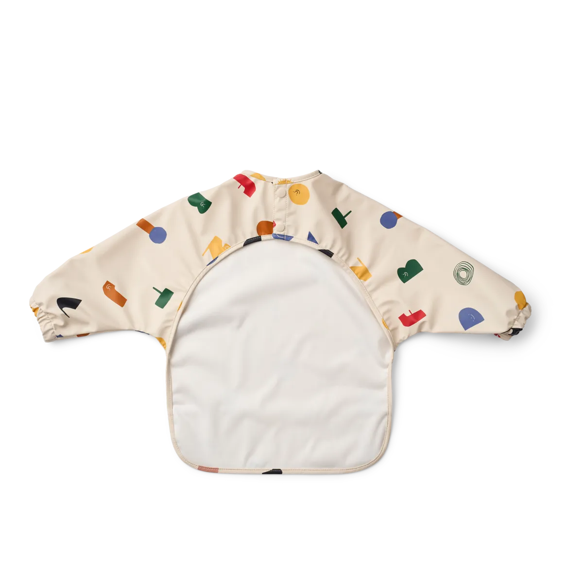 Práctico babero tipo capa con mangas largas y estampado característico.