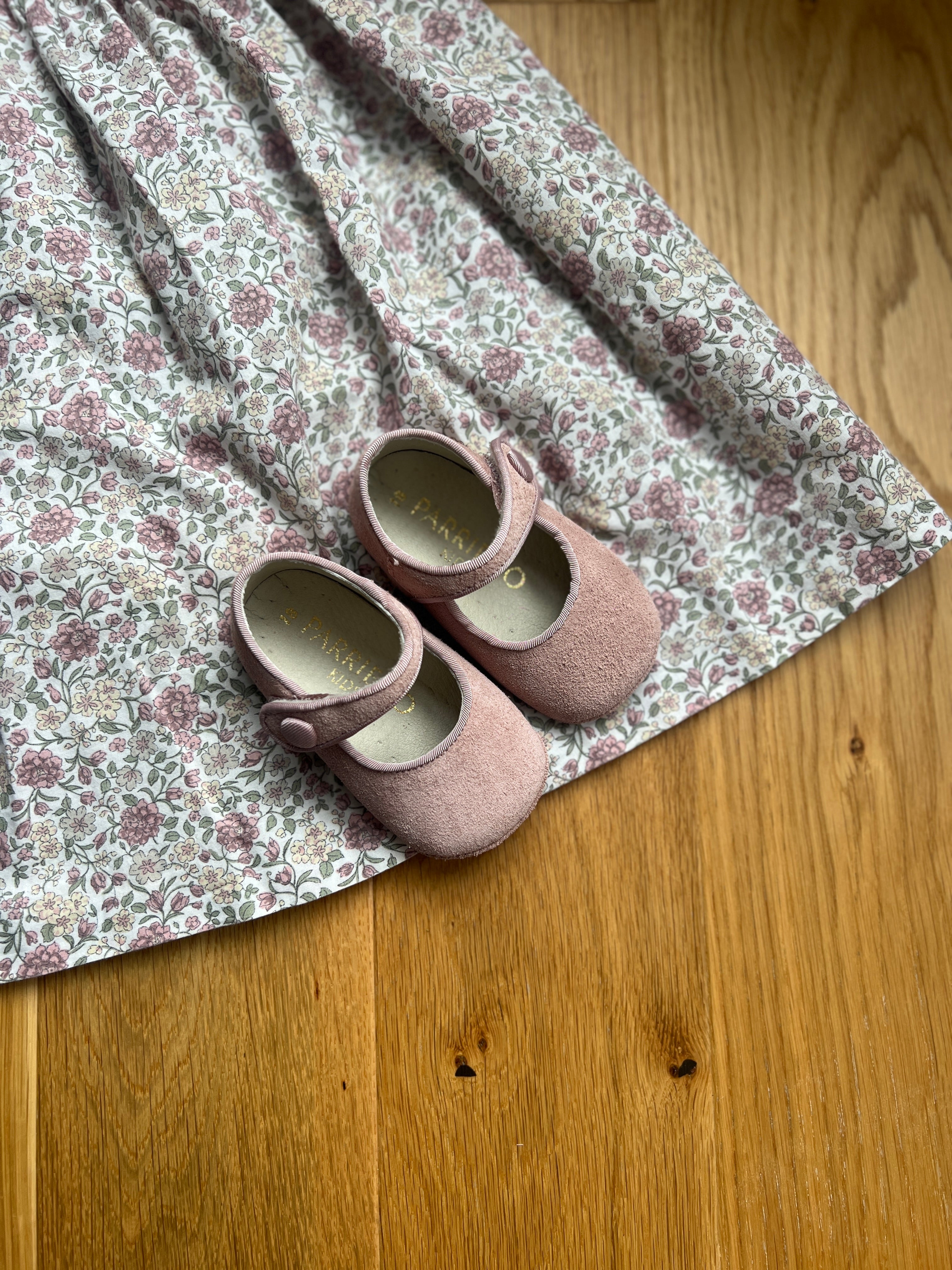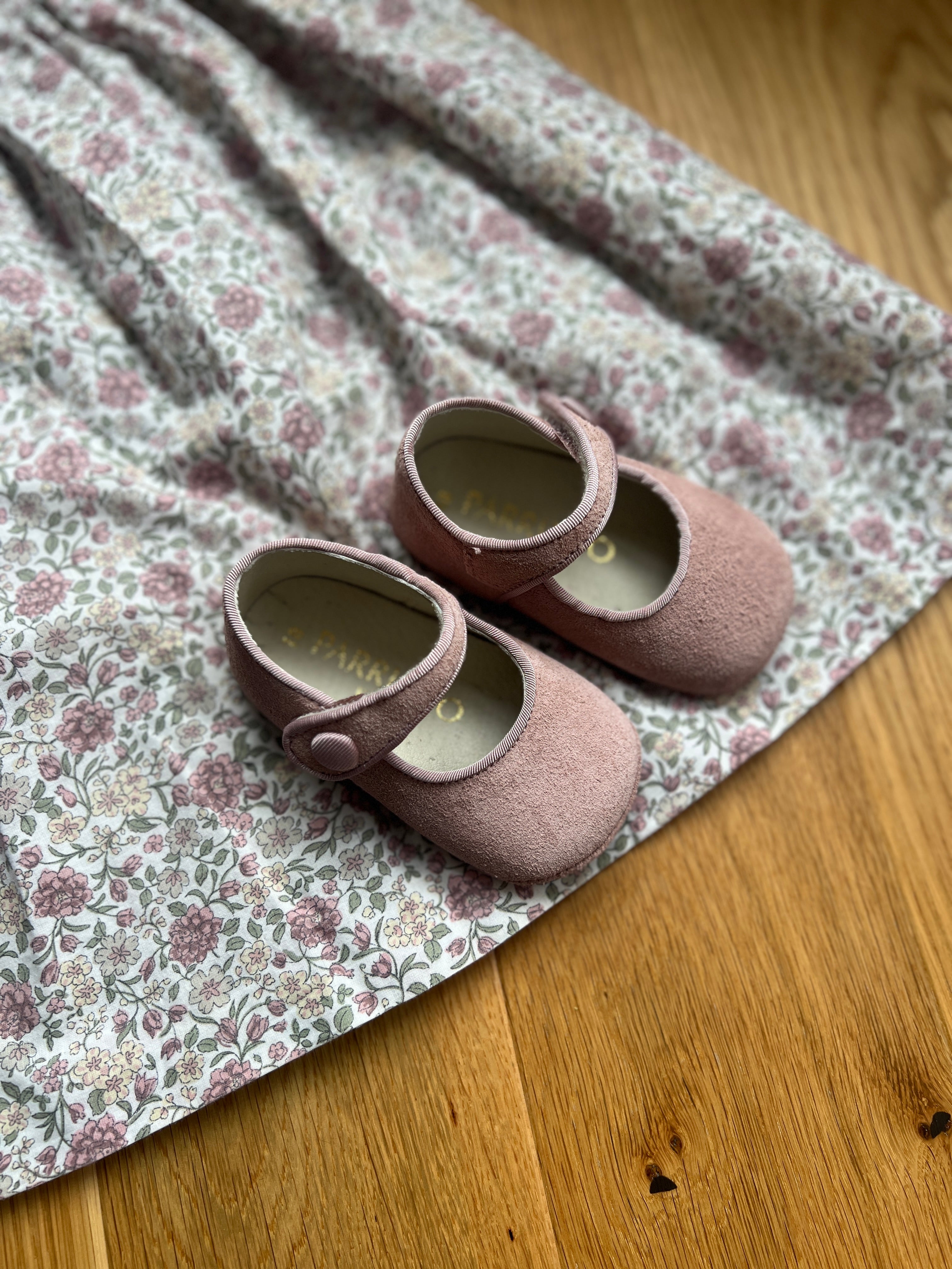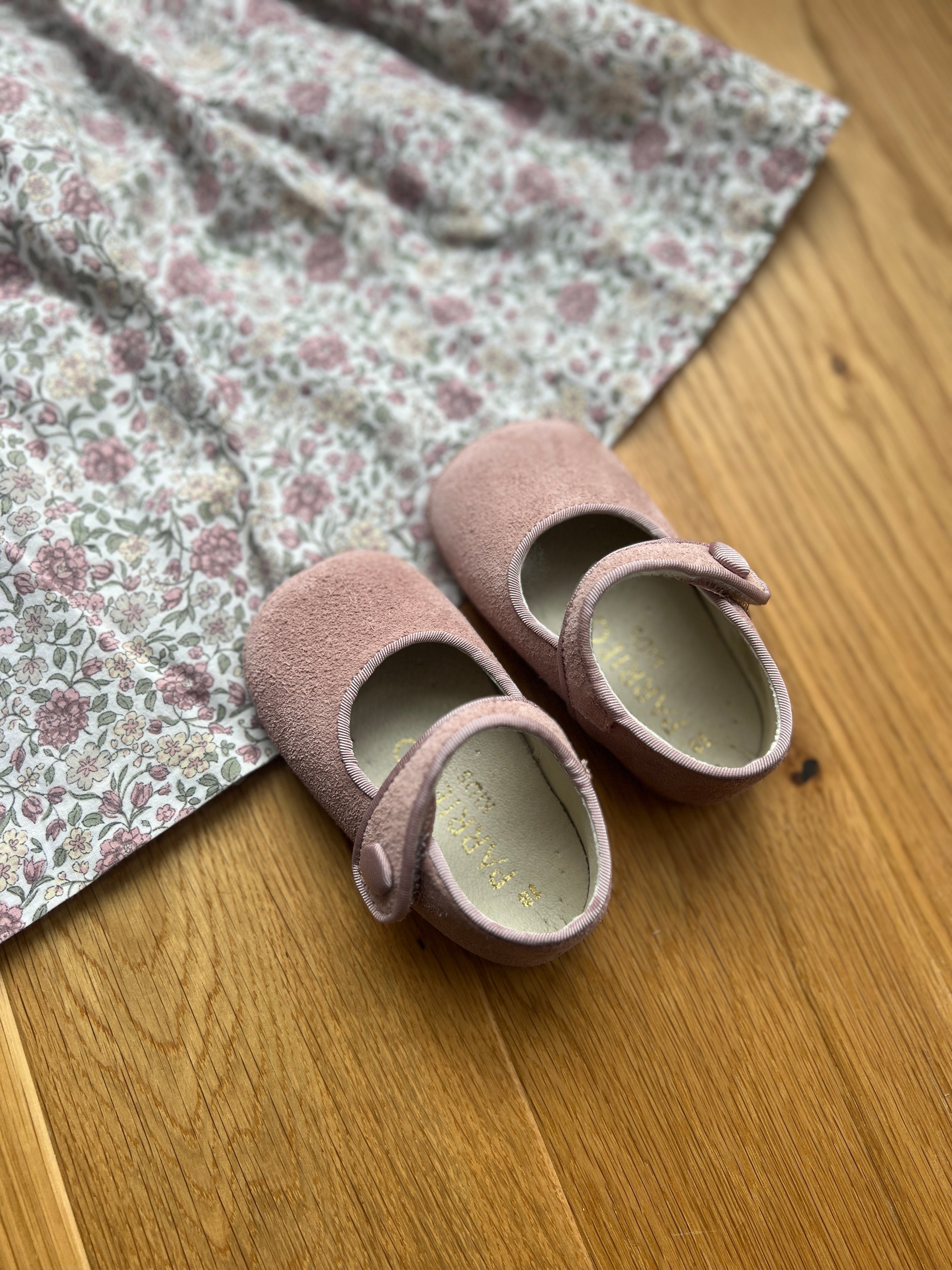 Están disponibles desde la talla 16 hasta la 19 en un serraje color rosa antique precioso y una napa muy suave en blanco roto y verde agua. Tallan bien, por lo que recomendamos comprar su número habitual. Si no sabes qué talla tiene tu bebé, en general se recomienda una talla 16 para los tres primeros meses de vida, la 17 hasta los 6 meses, la 18 hasta los 9 meses y la 19 a partir de los 9 meses, pero evidentemente dependerá de cada bebé y su estatura y peso.