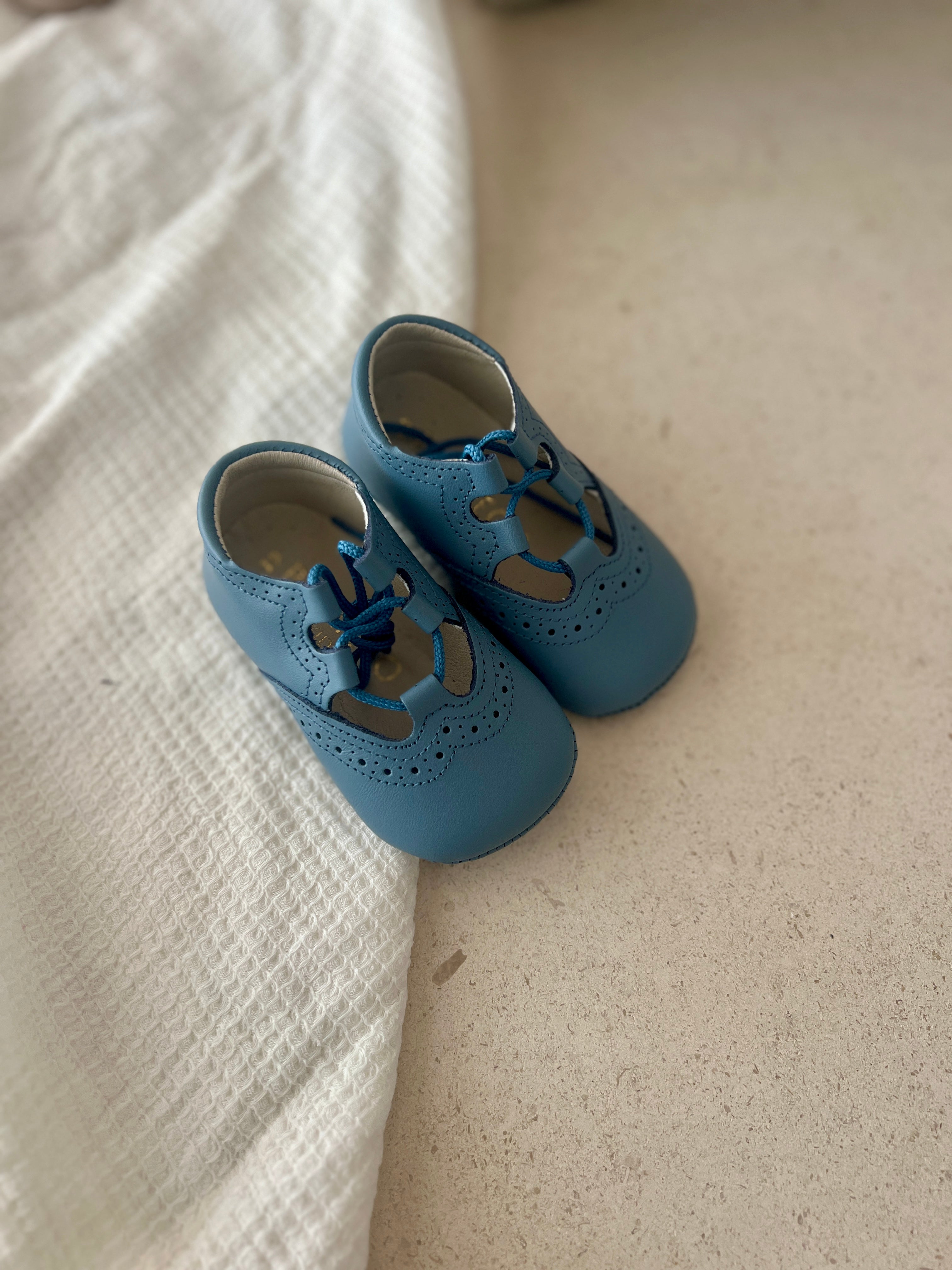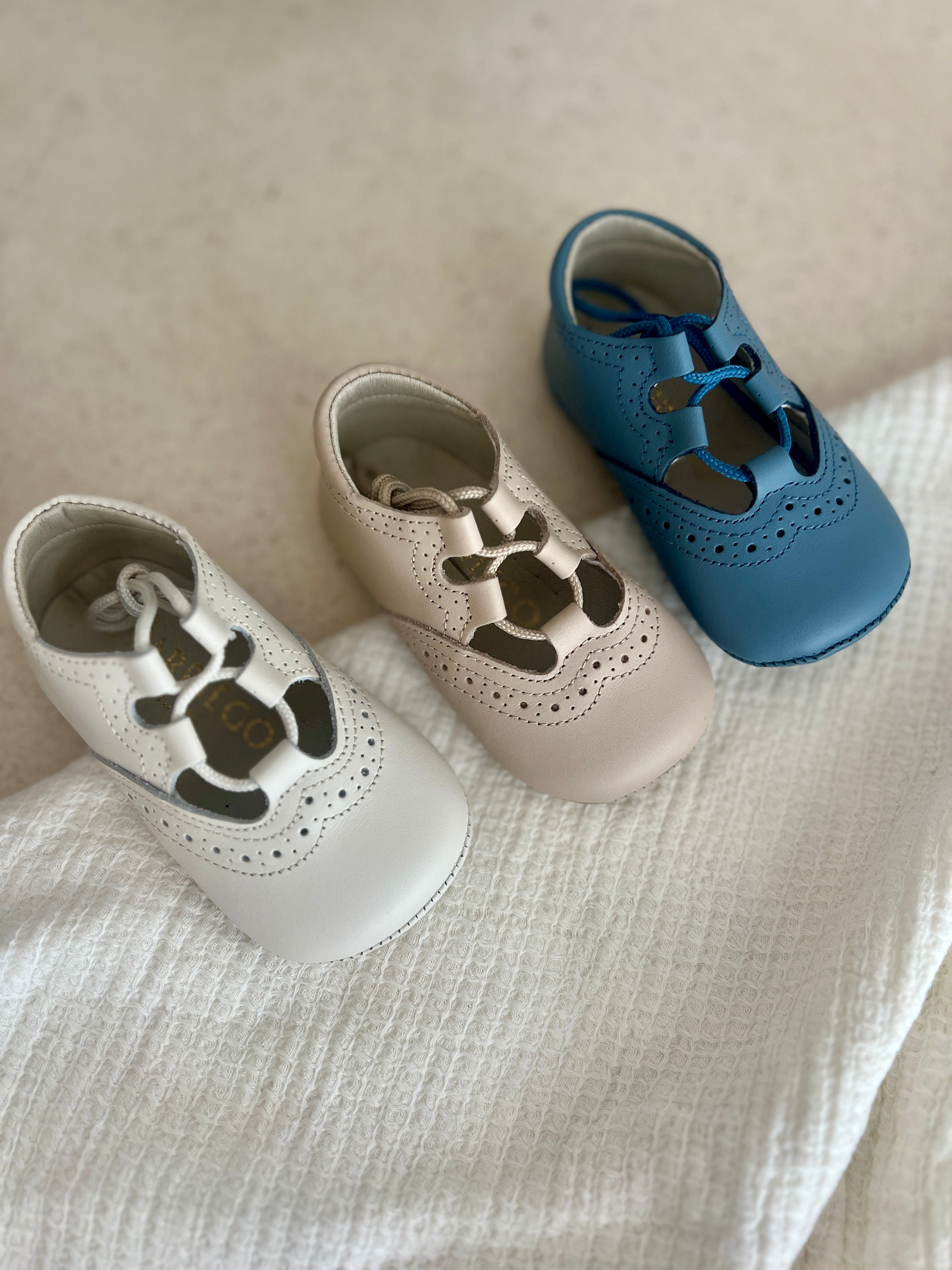 La badana inglés Nicolás se cierra con unos clásicos cordoncillos que permiten un ajuste perfecto en su pequeño piececito y al ser para preandantes no lleva suela. Podrás encontrarlos desde la talla 16 hasta la 19 en dos colores: una napa beige que pega con todo su armario y un todo más especial pero también combinable: napa azul azafata. ¿Cuál prefieres?