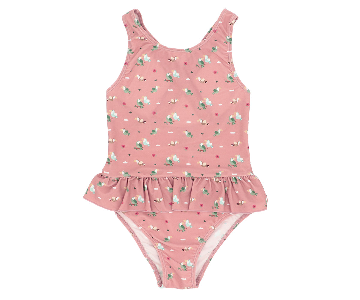 Bañador con volante de Monnëka que ha sido creado con una tela especial que protege a la piel de los rayos solares