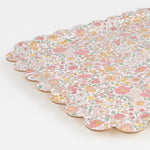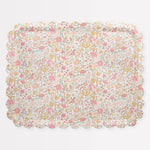 El estampado floral liberty con tonos rosas se combina con un borde festoneado para dar una apariencia sofisticada.