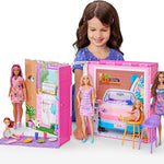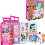 Barbie Getaway House Muñeca y conjunto de juego de casa con 4 áreas de juego, formadas por una cocina, un baño, un dormitorio en alto y un salón, 11 accesorios de decoración