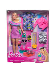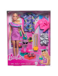Incluye: Muñeca Barbie con vestido lila de lentejuelas, vestido estilo camiseta, blazer rosa, falda plateada, y una selección de accesorios de moda.