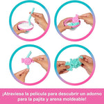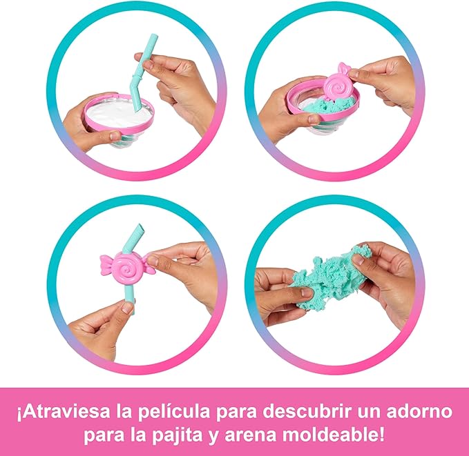 Desenrosca la tapa de nata montada para revelar arena moldeable y atraviesa la película con la pajita para descubrir una sorpresa blandita y un adorable accesorio para la pajita.