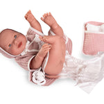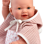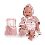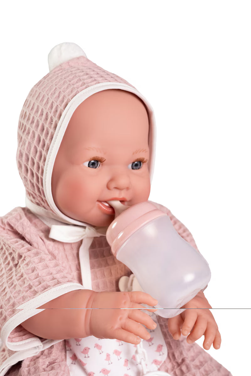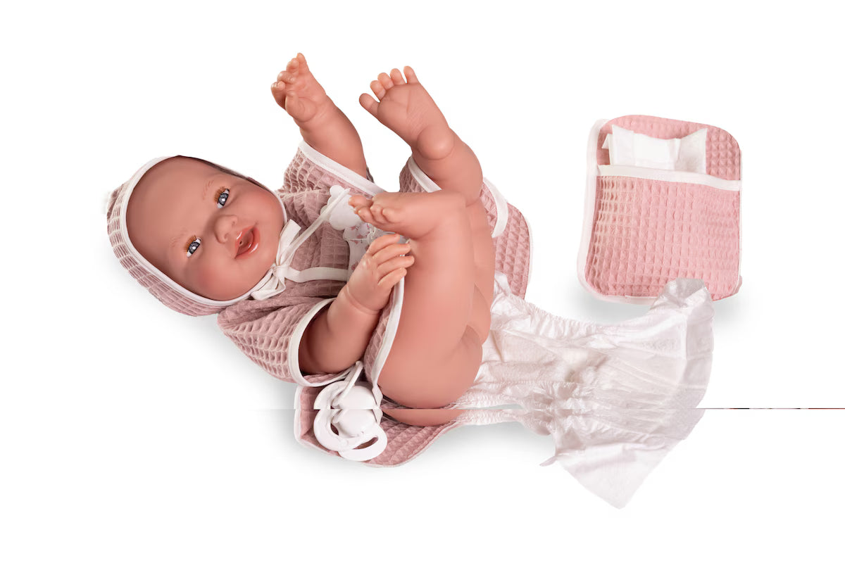 Mia es una recién nacida que ¡hace pipí cuando le das su biberón! Le encanta que le cojas en brazos y si la acuestas, cerrará sus ojitos para quedarse dormida. Tiene muchos complemetos para jugar con ella, su chupete, su pañal... Además Mia lleva una bañera para que la puedas bañar y se relaje antes de dormir. Lleva una capita de baño a juego con su neceser. Su cuerpo es de suave vinilo sexuado. ¡Mia es una niña!. Mide 42 cm y estará encantada de que la cuides y le cambies el pañal cuando se haga pipí. ¿Hay algo más adorable que un bebé? Los Recién Nacidos son la esencia de Muñecas Antonio Juan. Un universo de dulzura creados para acompañar a los más pequeños a descubrir el mundo. Compañeros inseparables de largos días de juegos a los que no les falta detalle en sus tiernas facciones y calidad de su ropita y complementos.