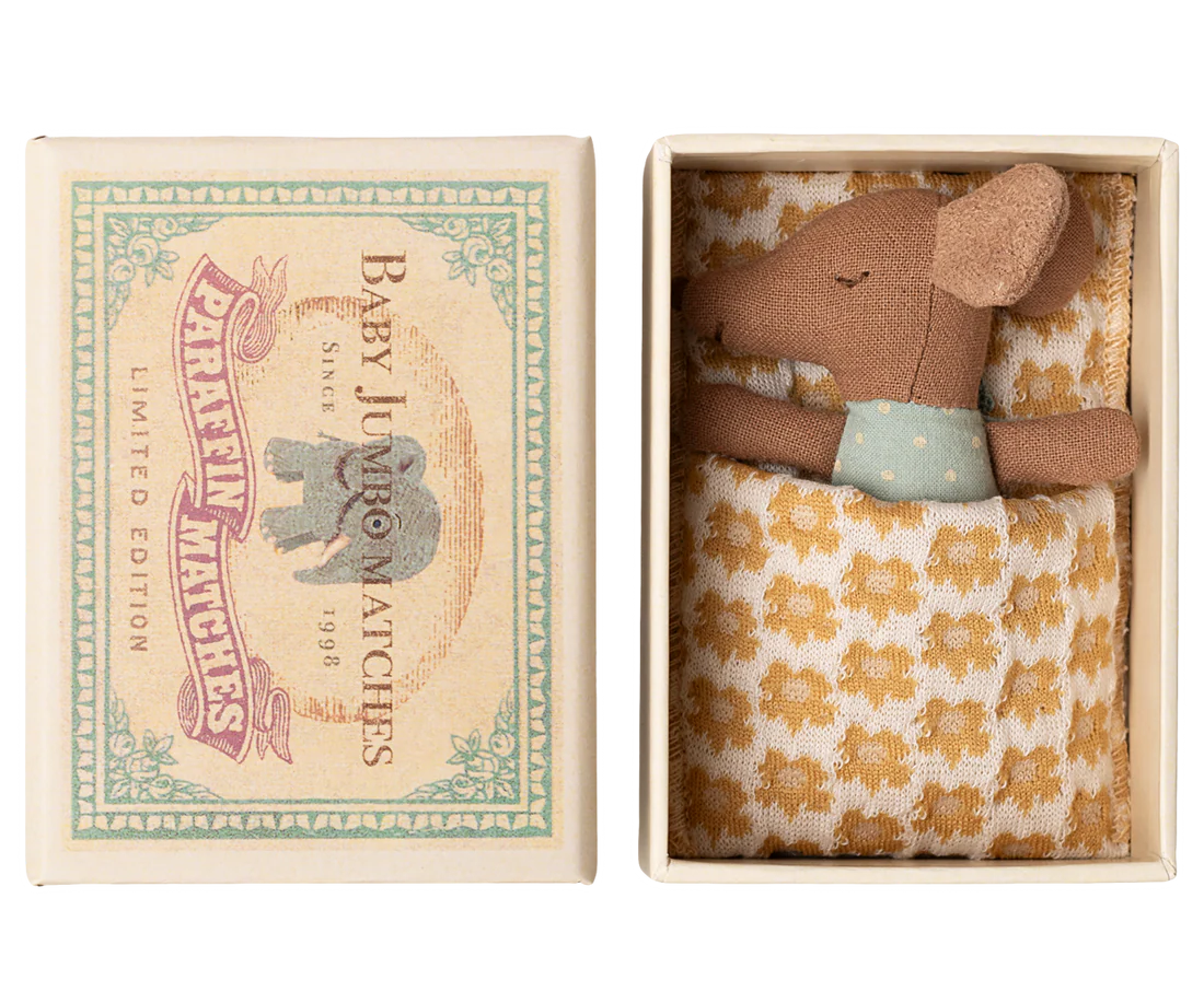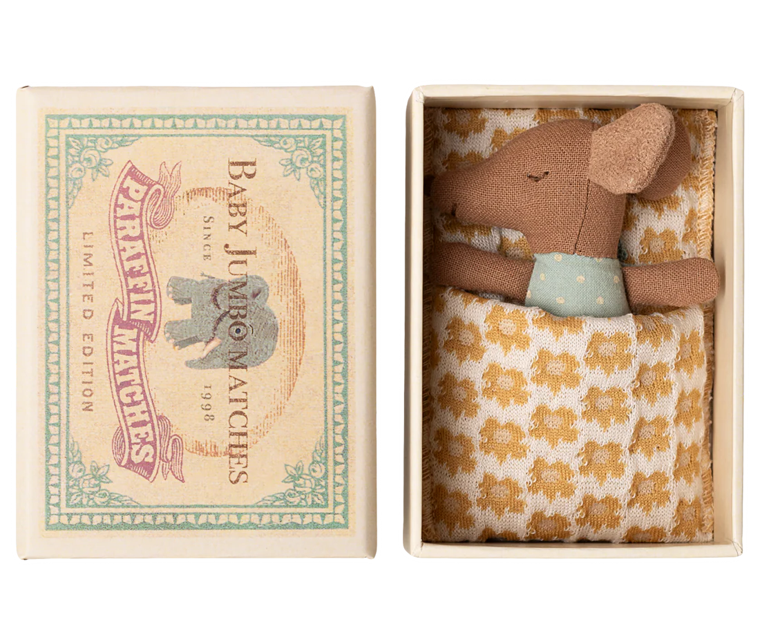Un artículo clásico de Maileg. Este ratón está listo para horas de juego y duerme plácidamente en la pequeña caja de cerillas. La vestimenta y la ropa de cama están confeccionadas con tejidos suaves y estampados únicos en bonitos colores.