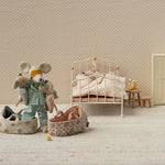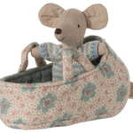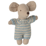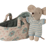 Un pequeño bebé ratón en un traje de punto suave rayado. Duerme durante horas en su pequeño capazo acolchado.