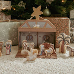 Play box con todos los personajes del Belén. La caja es portátil y fácil de guardar. Está hecho de cartón macizo y las figuras son de madera. Incluye niño Jesús, José y María, ángel, pastor, burro y buey, 2 ovejas, reyes magos, camello, palmera y estrella.
