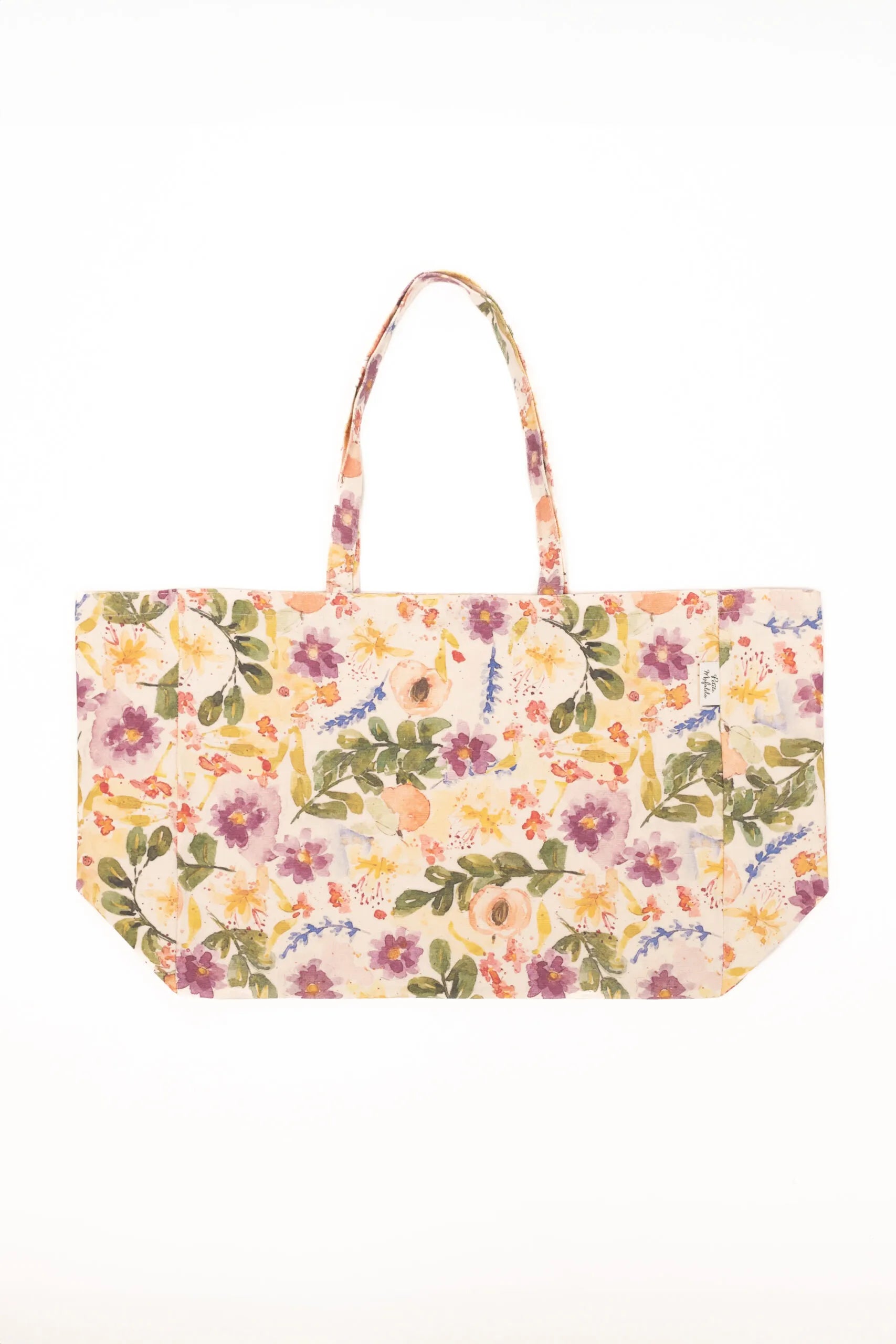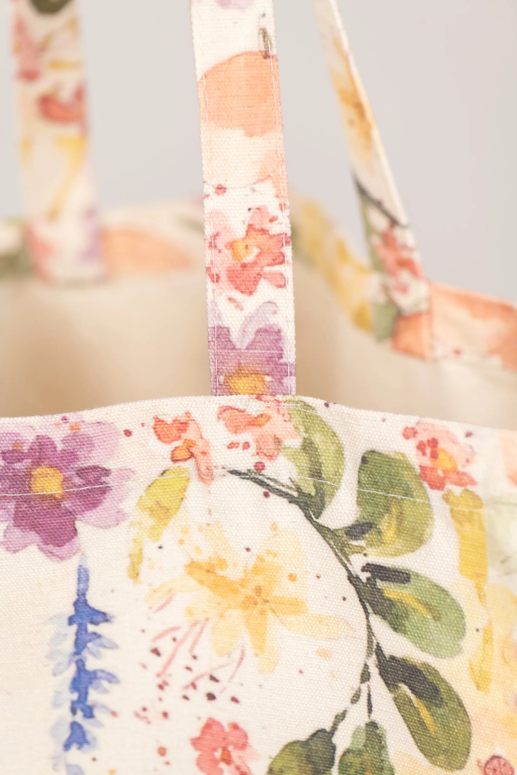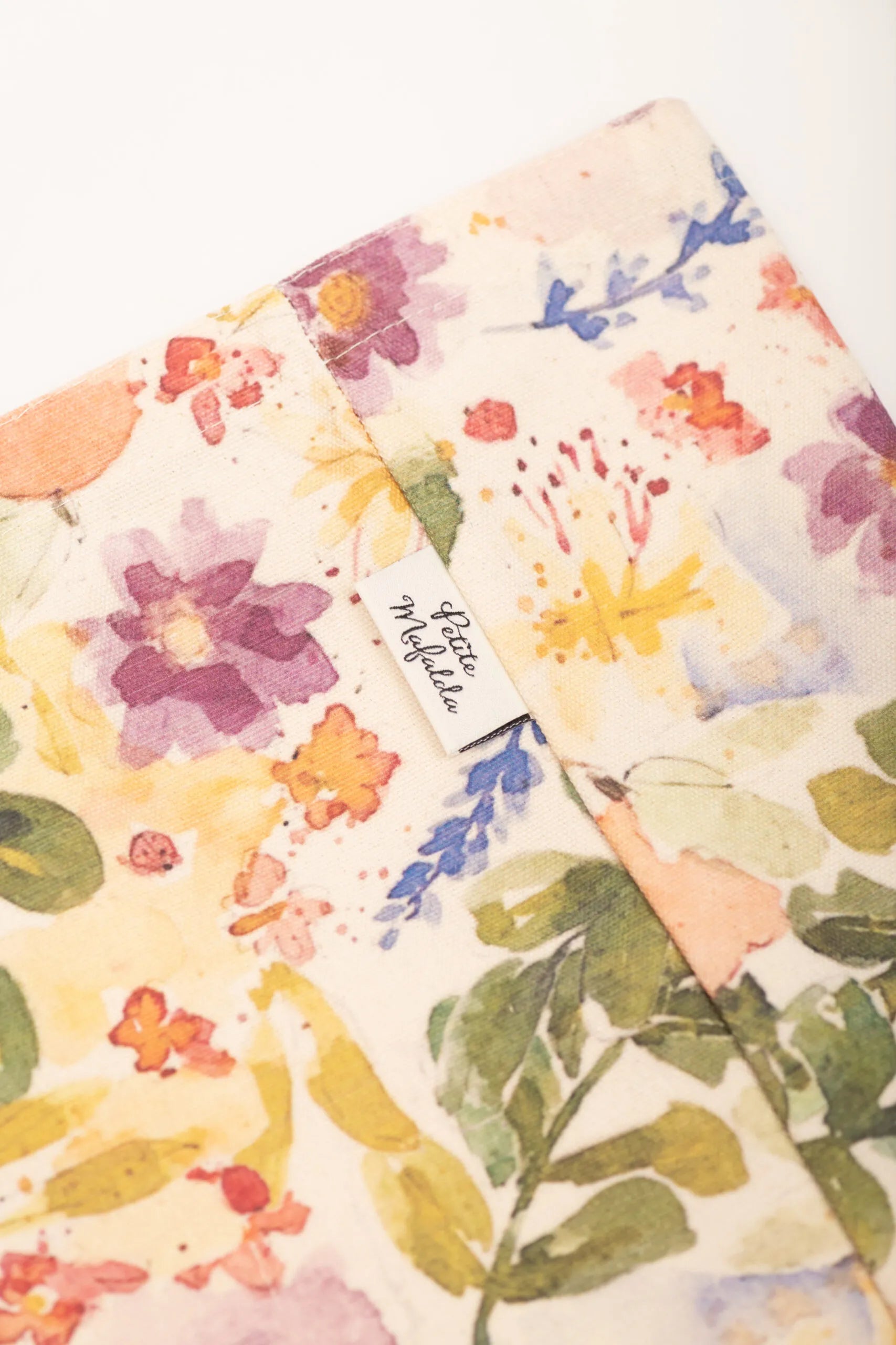 Estampada con flores pintadas en acuarela verdes, moradas, mostazas y melocotón