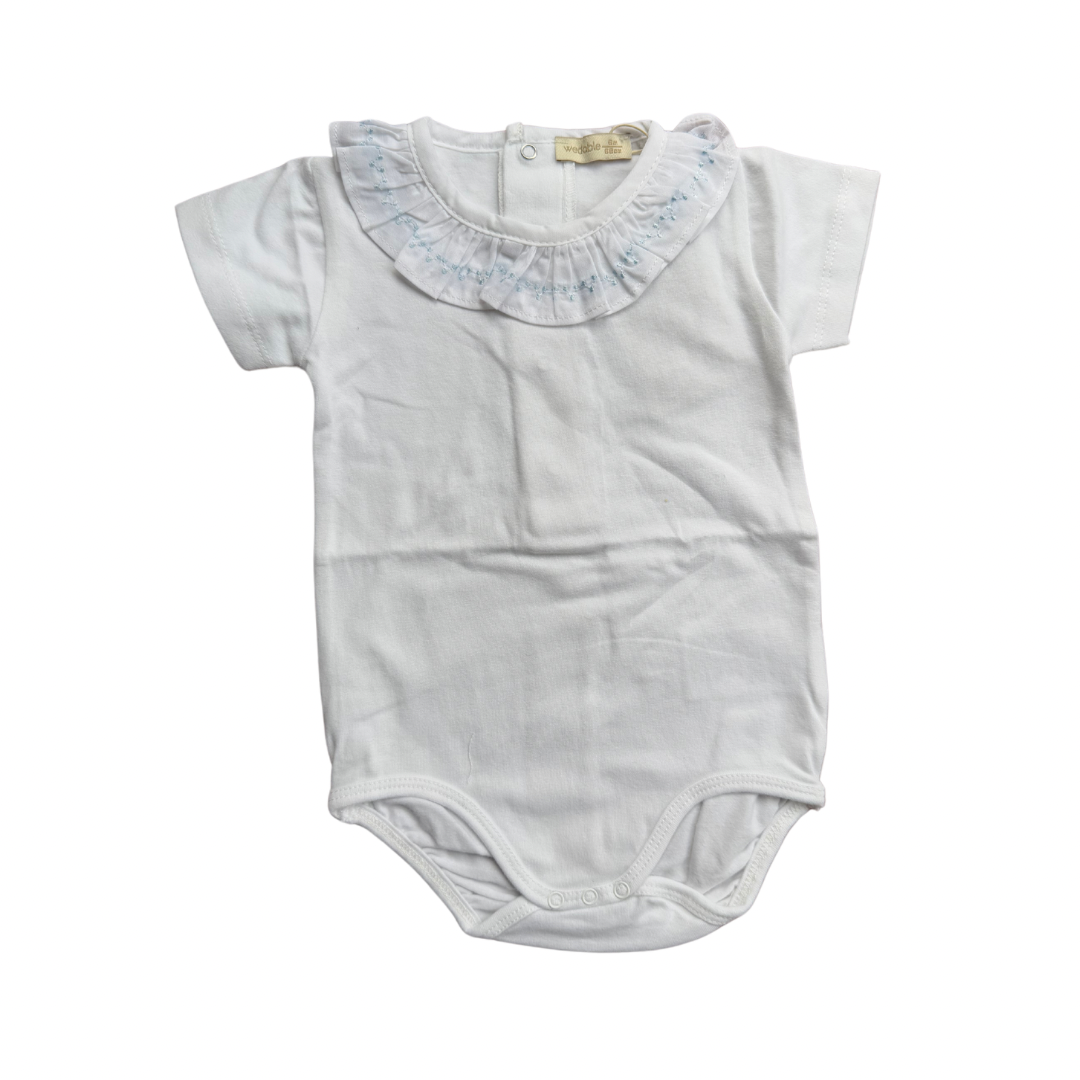 Body clásico de manga corta ideal para bebés niños y niñas. El body de manga corta con volantes está confeccionado en punto blanco de algodón ligero y tiene cuello con volantes bordado. Se cierra con automáticos en la espalda y entre las piernas. El bordado está disponible en diferentes colores.