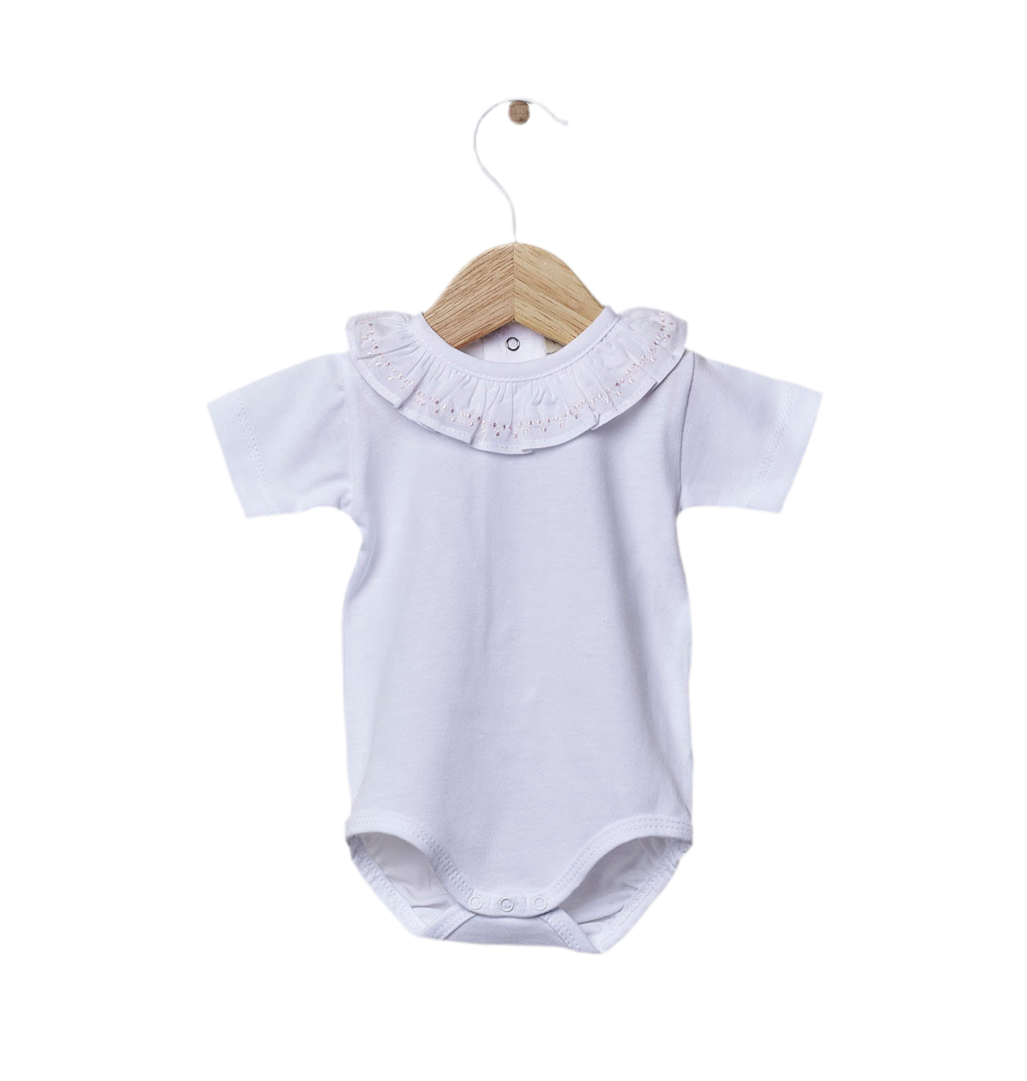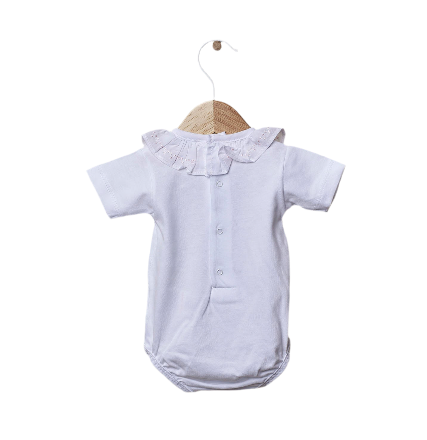 Body clásico de manga corta ideal para bebés niños y niñas. El body de manga corta con volantes está confeccionado en punto blanco de algodón ligero y tiene cuello con volantes bordado. Se cierra con automáticos en la espalda y entre las piernas. El bordado está disponible en diferentes colores.