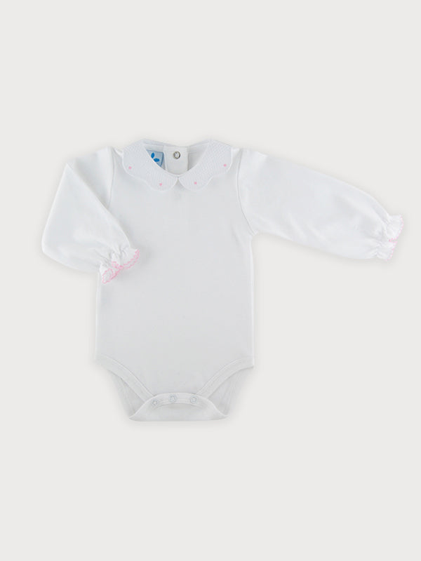 Body Cuello Ondas Piqué Rosa. Cierre con corchetes en la espalda y entre las piernas.