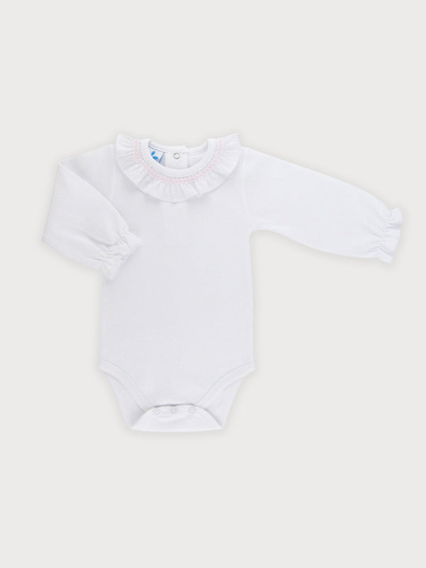 Body Cuello Volante Smock Rosa. Cierre con corchetes en la espalda y entre las piernas.