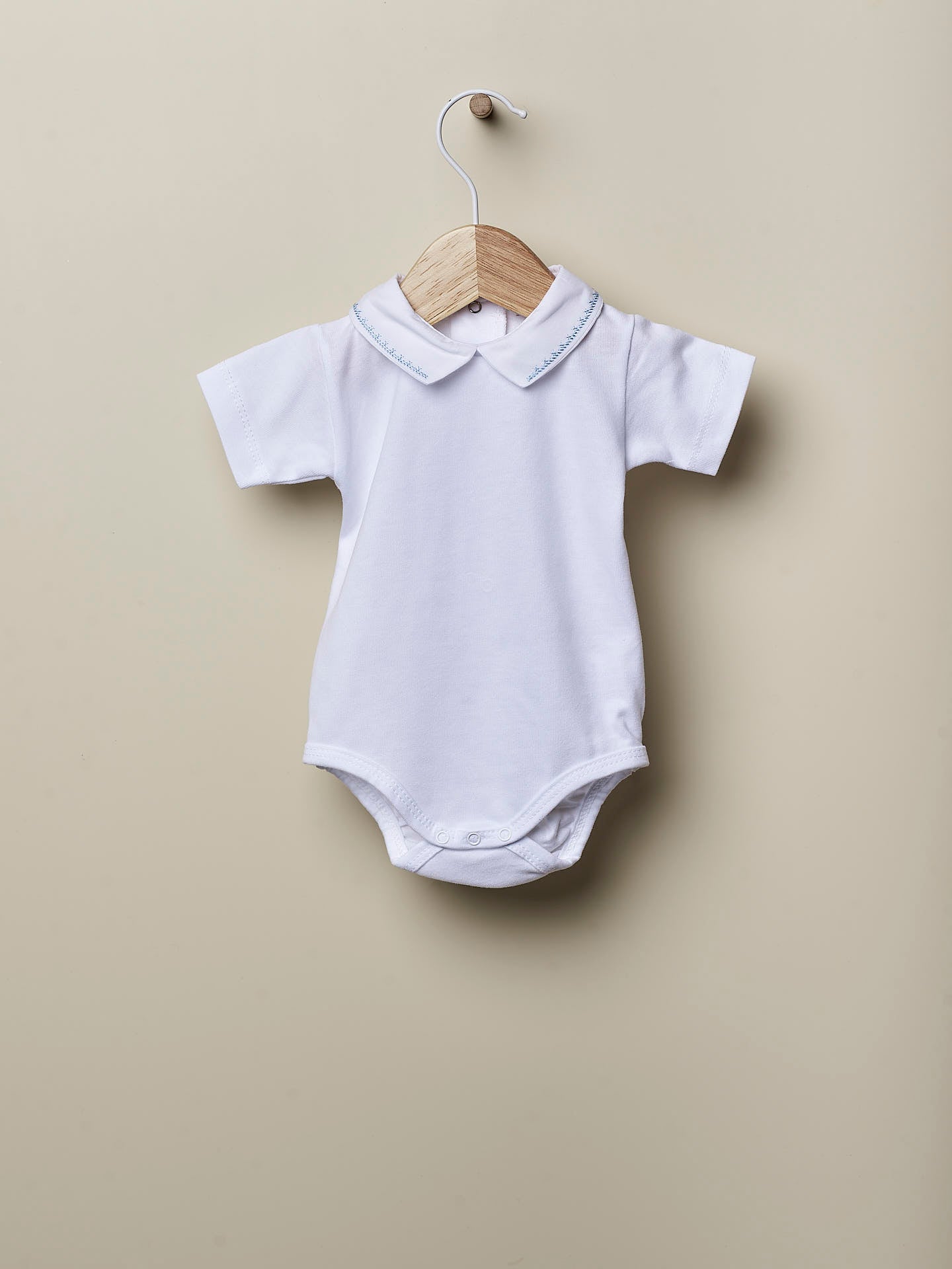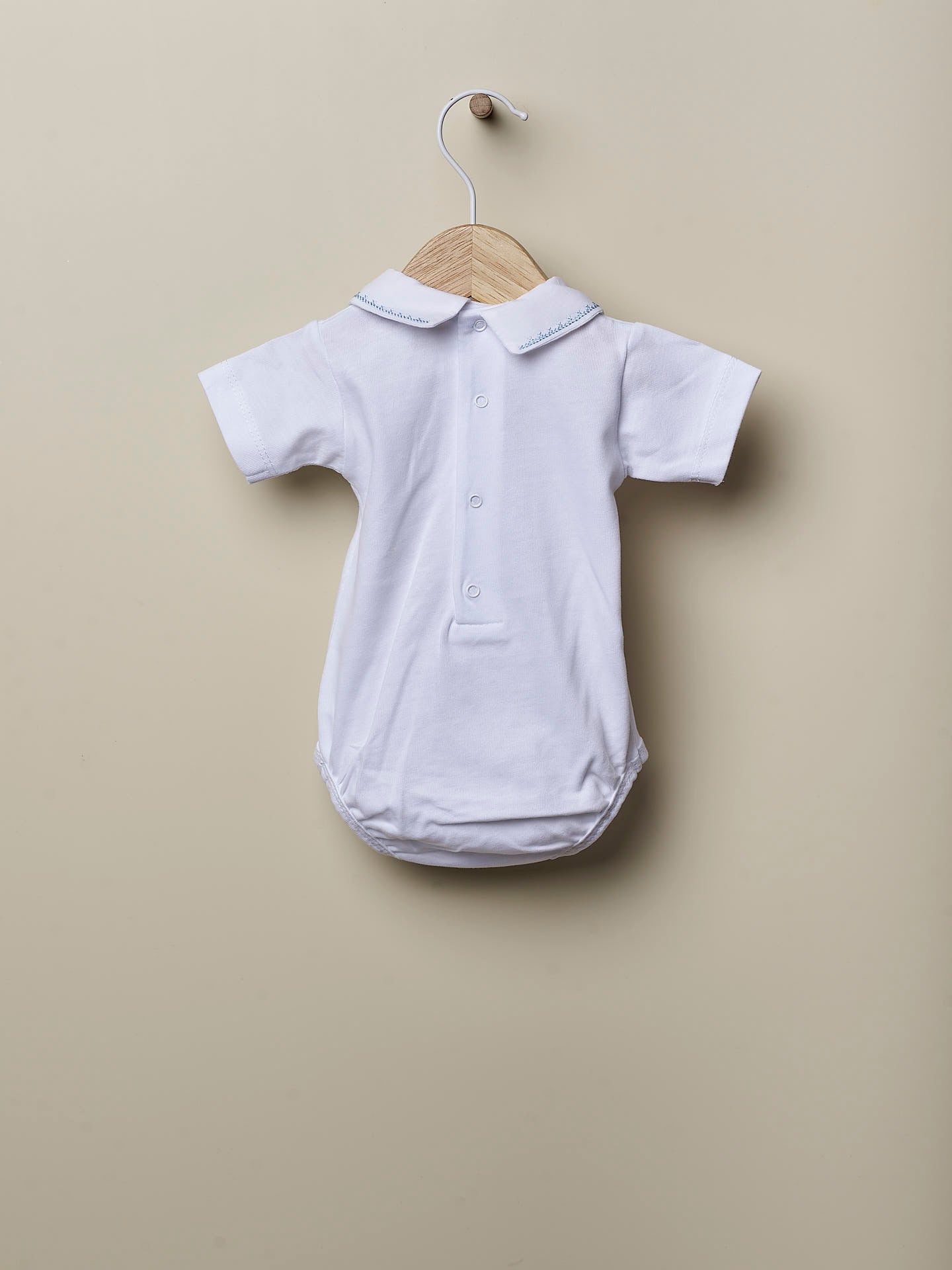 Body clásico con cuello en V y manga corta ideal para bebés. Está confeccionado en punto blanco de algodón ligero y tiene cuello en V bordado. Se cierra con automáticos en la espalda y entre las piernas.