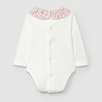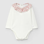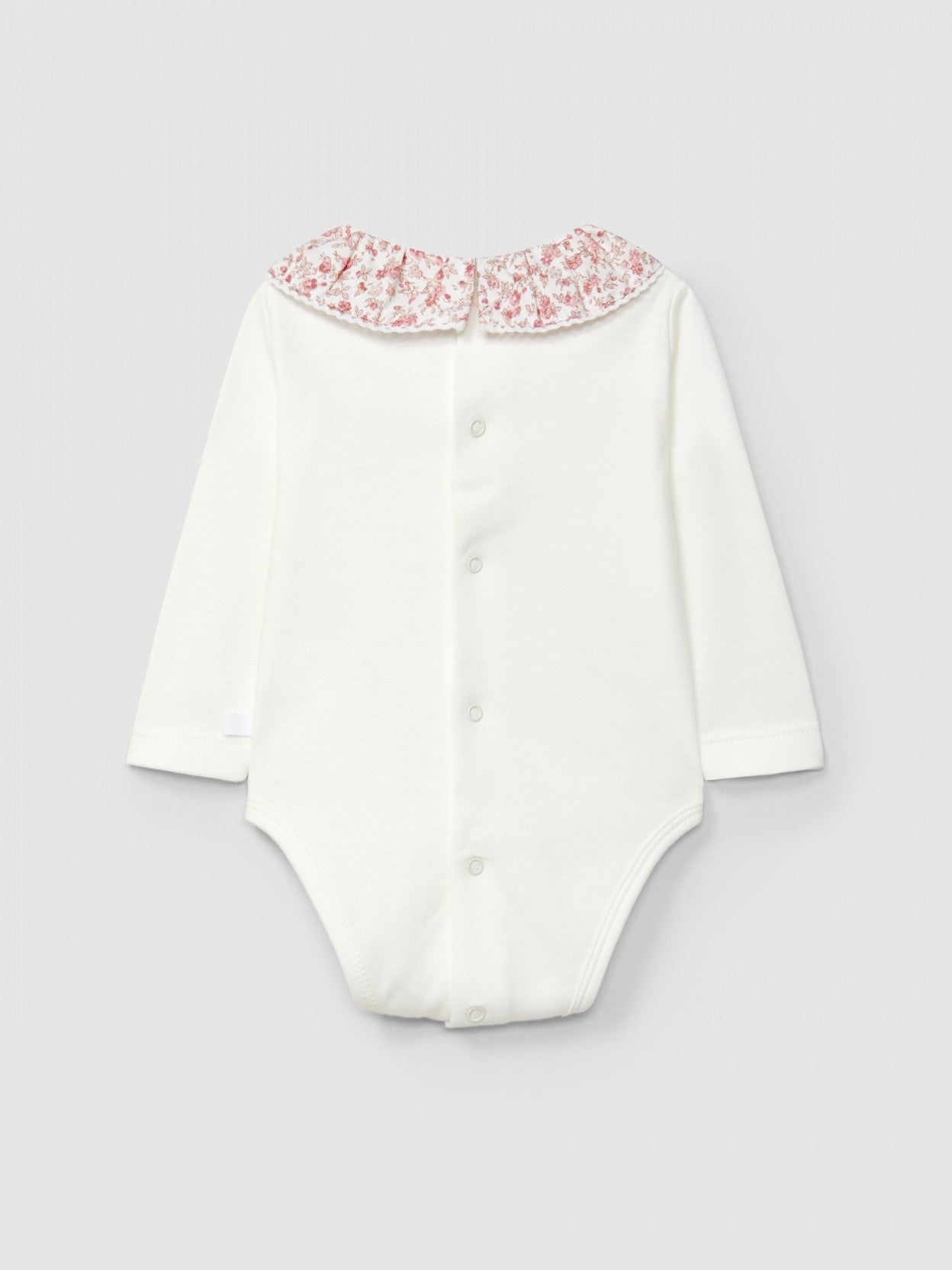 Body de jersey 100 % algodón suave y cepillado. Cuello con volantes en tejido floral con detalle de encaje. Cierre con corchetes en la espalda y entre las piernas.