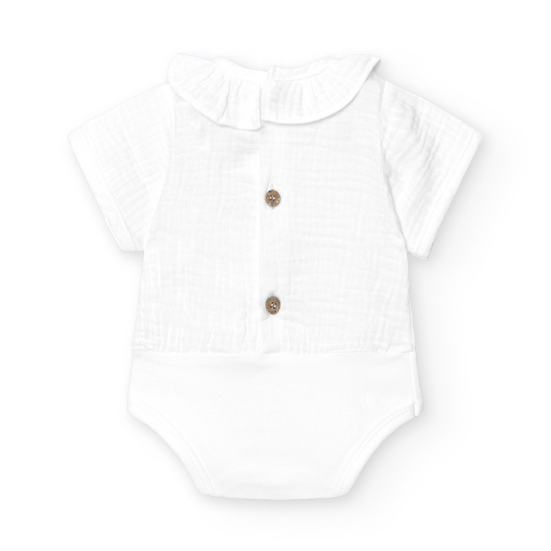 Body de manga corta con cuello volante en tejido de Bambula.