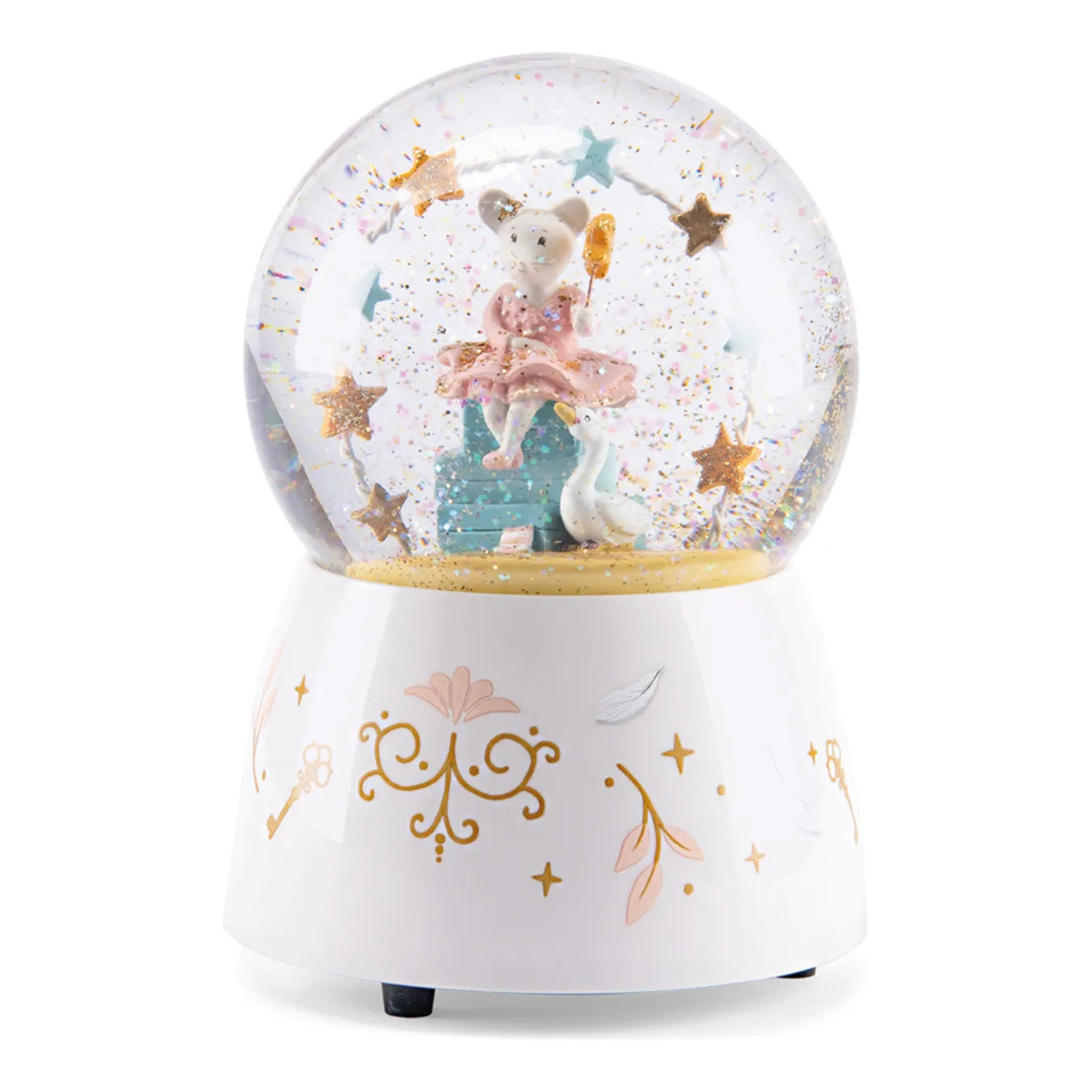 ¡El ratoncito y su ganso están de fiesta envueltos en purpurina holográfica! Además de decorar la habitación del niño, esta bola de nieve emite una bonita melodía para arrullarlo.