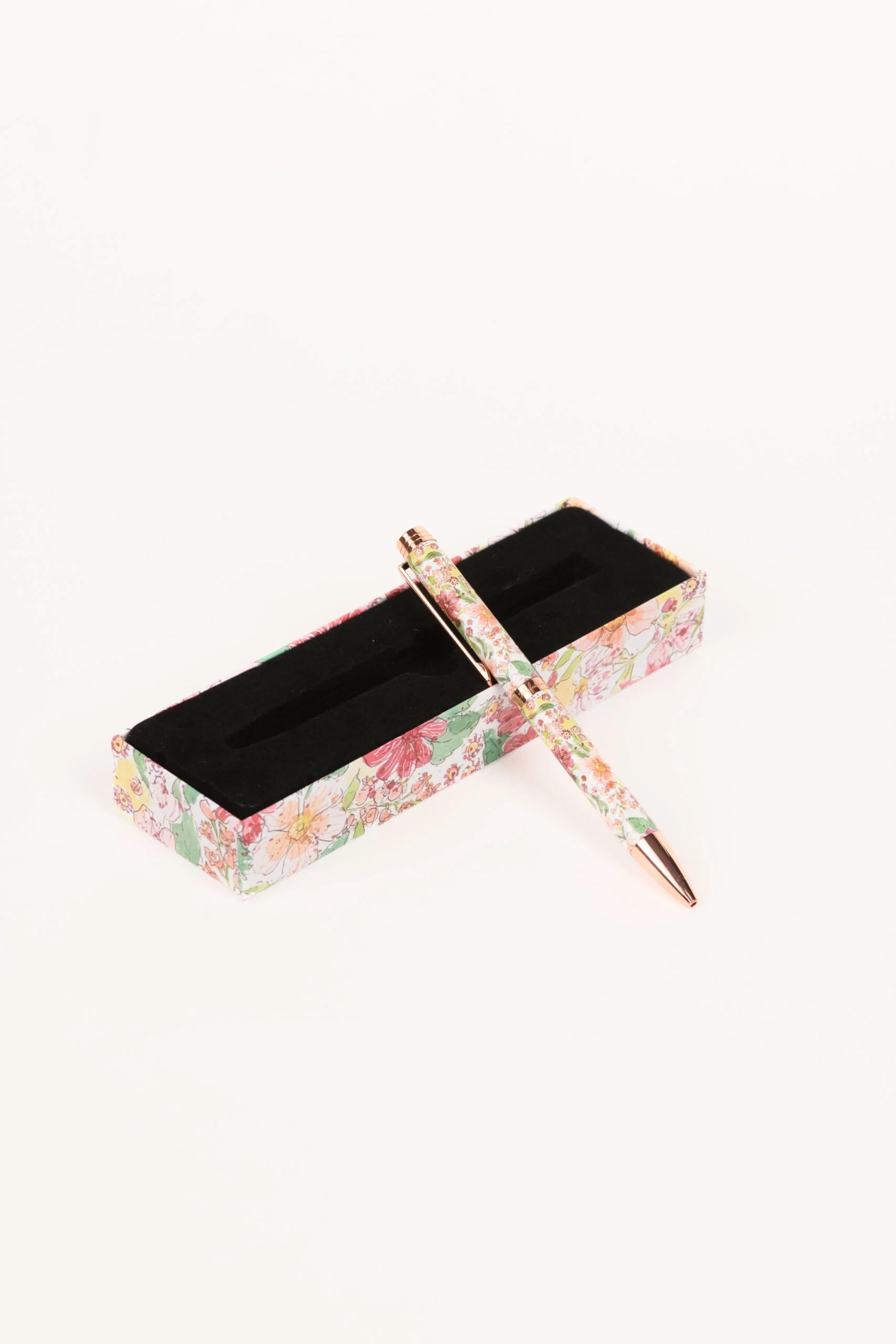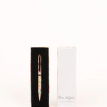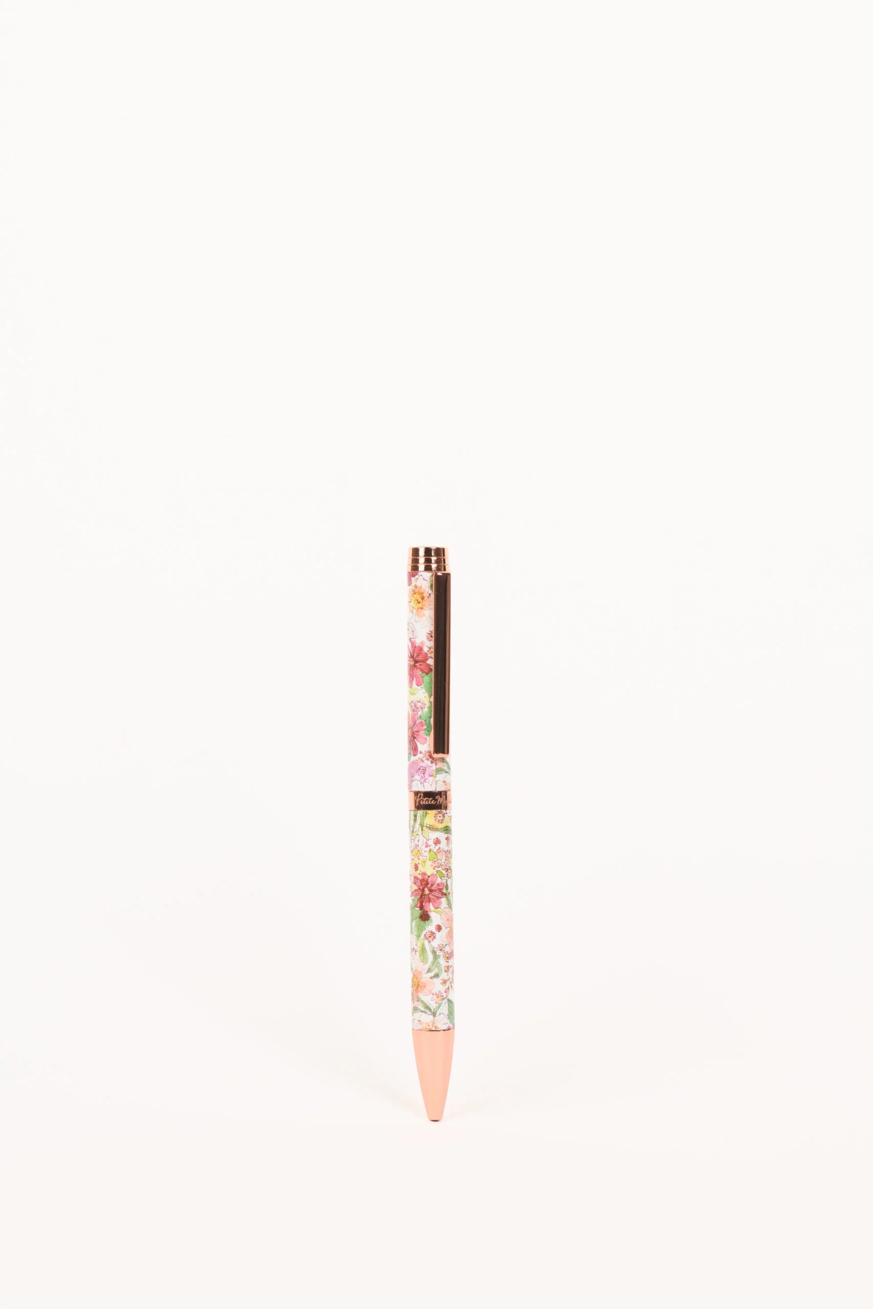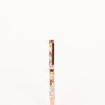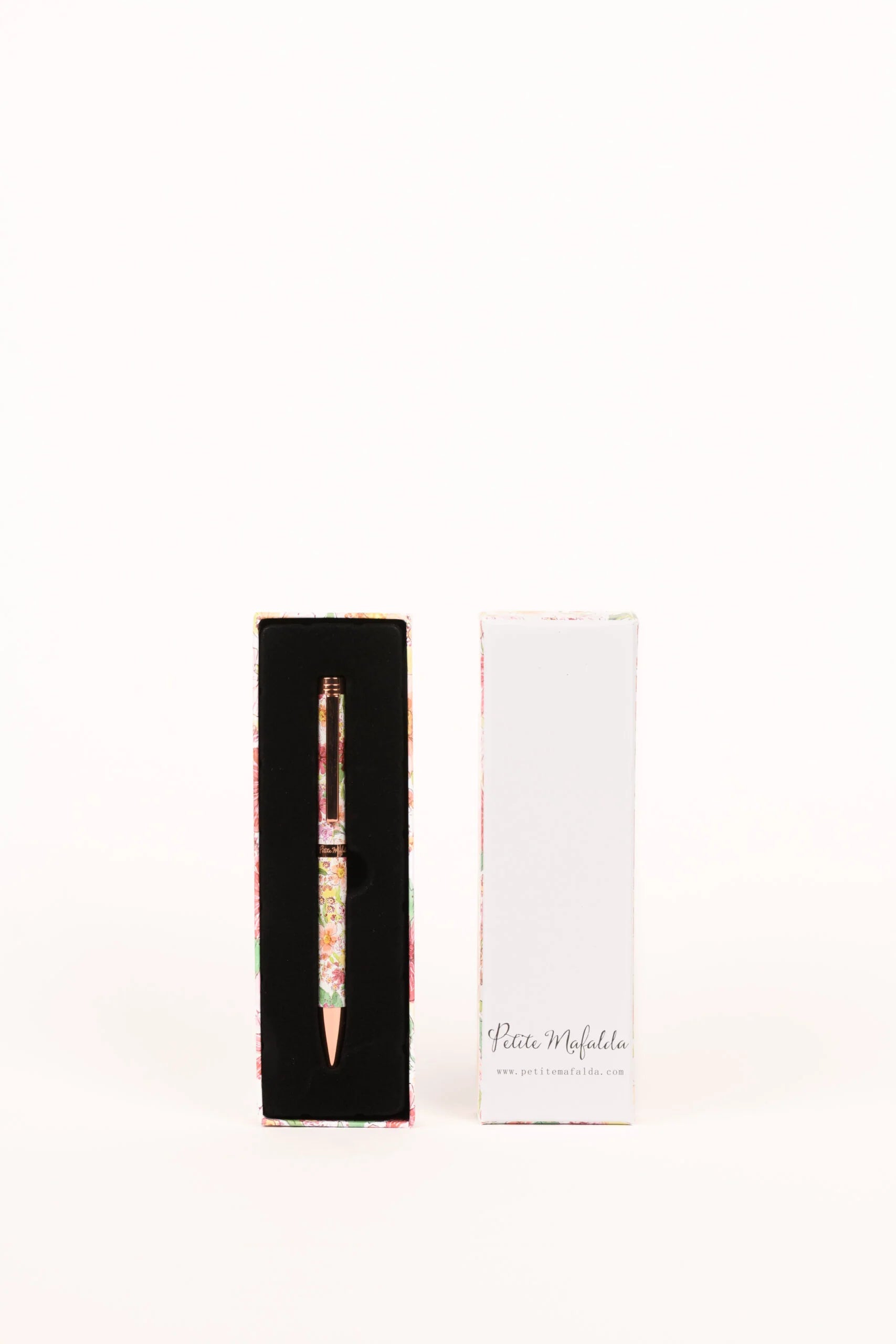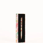 Bolígrafo fabricado en metal de tinta azul completamente estampado con flores pintadas a mano.