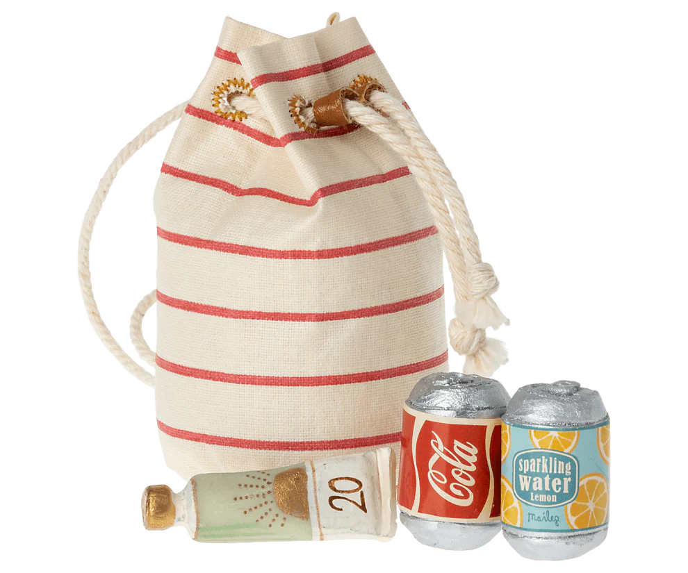 Tiempo de vacaciones. Este pequeño bolso incluye todos los imprescindibles para un día de sol: crema solar y 2 refrescos. Todo viene en un tamaño miniatura que se adapta a los amigos Maileg más pequeños. Tenga en cuenta que no puede abrir las latas de protector solar ni de refrescos.