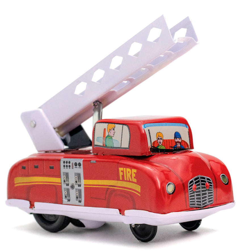 Empuje hacia abajo la escalera del camión de bomberos y nuestro camión de bomberos clásico saldrá corriendo. Este camión de bomberos totalmente de hojalata cuenta con un ingenioso motor Press n Go oculto en la escalera.