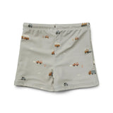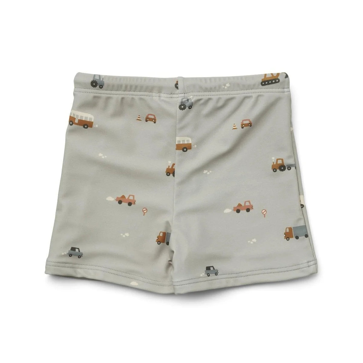 Bañador tipo bóxer realizado en poliester reciclado con divertido estampado de vehículos y protección ultravioleta 50+ de la marca Liewood.