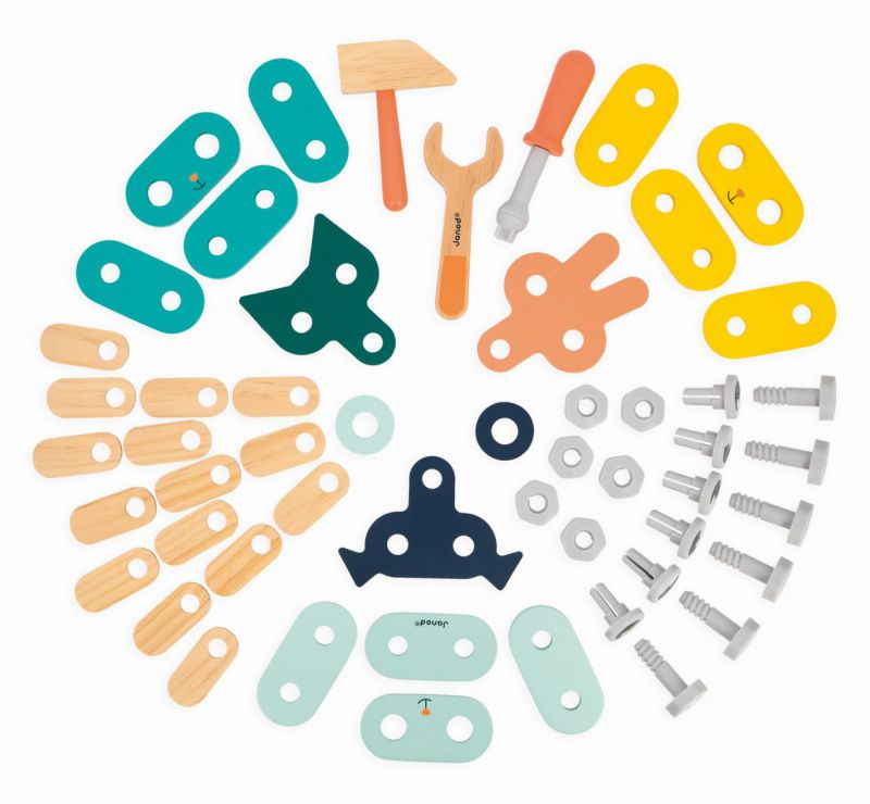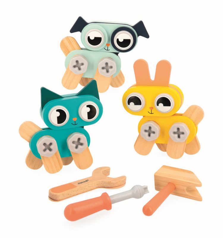 ¡3 divertidos animalitos para montarlos tú mismo! Con 3 herramientas, 32 piezas de madera y 18 elementos de plástico (tornillo, tuercas, inserciones) su hijo podrá dar vida al pequeño compañero que elija: 1 perro (18 piezas) + 1 gato (16 piezas) o 1 conejo (16 piezas). ¡Práctico! Los 3 animales también se pueden montar al mismo tiempo. Se incluye una tarjeta modelo para cada animal para facilitar el montaje. Desarrolla la imaginación y la destreza. Un pequeño plus: los tornillos tienen muescas para añadir un poco más de jugabilidad y dificultad. Juguete de imitación de madera FSCTM para niños a partir de 3 años.