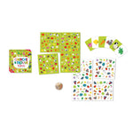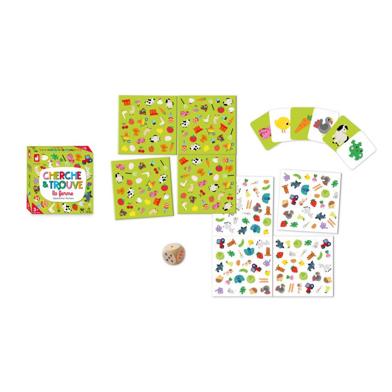 ¡Inmersión inminente en la granja! El objetivo del juego es encontrar juntos elementos en los tableros para ganar 10 tarjetas. Se elegirá el lado blanco o verde del tablero y se jugará con el lado de las tarjetas del mismo color. El jugador más joven tirará el dado, luego cogerá una tarjeta y la mostrará a los demás jugadores. Ese es el elemento que deberán encontrar en el tablero, las veces que indique el número del dado. La tarjeta se ganará si se alcanza el número de elementos que hay que encontrar. De lo contrario, la tarjeta se perderá. Se puede jugar de forma rápida: se deberá ganar el número máximo de tarjetas en 5 minutos. ¡También se puede jugar solo! La caja contiene 1 tablero de juego de doble cara dividido en cuatro partes, 20 tarjetas de doble cara, 1 dado de madera y las reglas del juego en 7 idiomas. Una partida "clásica" dura unos 15 minutos. De 1 a 4 jugadores. A partir de 3 años