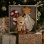 El tierno reno siempre está listo para un gran abrazo y para jugar a las aventuras. Este set también incluye un peluche de candy bar que con sus llamativos colores estimula la coordinación mano-ojo y la curiosidad en los bebés. Los tres productos están empaquetados en una hermosa caja de regalo.
