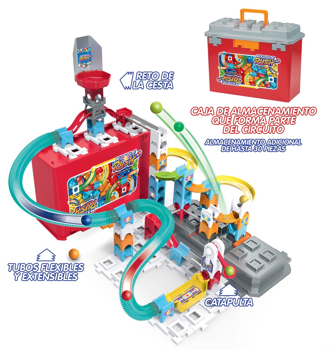 Catapulta, canasta, curvas, bajadas y rectas desafiantes con intrépidos desafíos por donde se lanzarán las canicas que incluye el juguete.