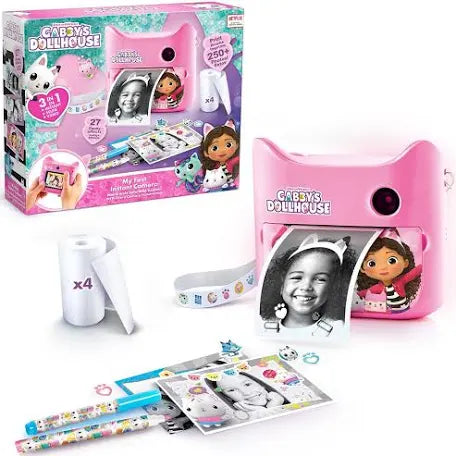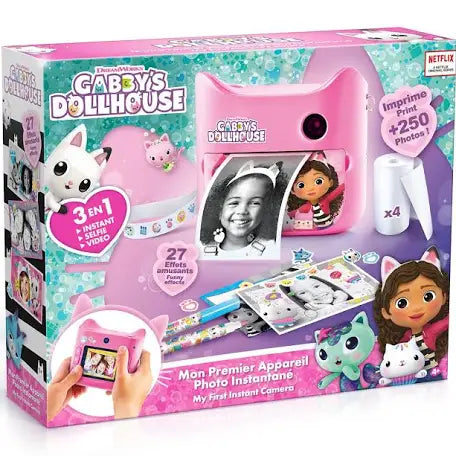 ¡Una cámara con un diseño único de Gabby y todos sus amigos! Los filtros y pegatinas suministrados también son del dibujo animado, ¡para que puedas personalizar tus fotos! Haz fotos en modo retrato, paisaje o selfie con la doble lente. Después, con un solo clic, imprímelas al instante en blanco y negro y crea tu propio estilo personalizándolas con los rotuladores y pegatinas incluidos.