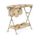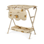Cambiador de muñecas con estructura de metal robusto y mesa de suave algodón. Mucho espacio para guardar los suministros de tu muñeca debajo y en los bolsillos laterales. Diseñado con terminaciones festoneadas.