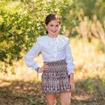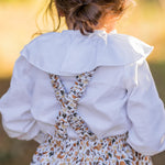 Camisa capa en tejido de viyela blanca con cuello muy especial, será la delicia del armario de tu peque ya que le dará el toque a todos los petos, faldas y demás.. con cuello capa con terminación en lazada.