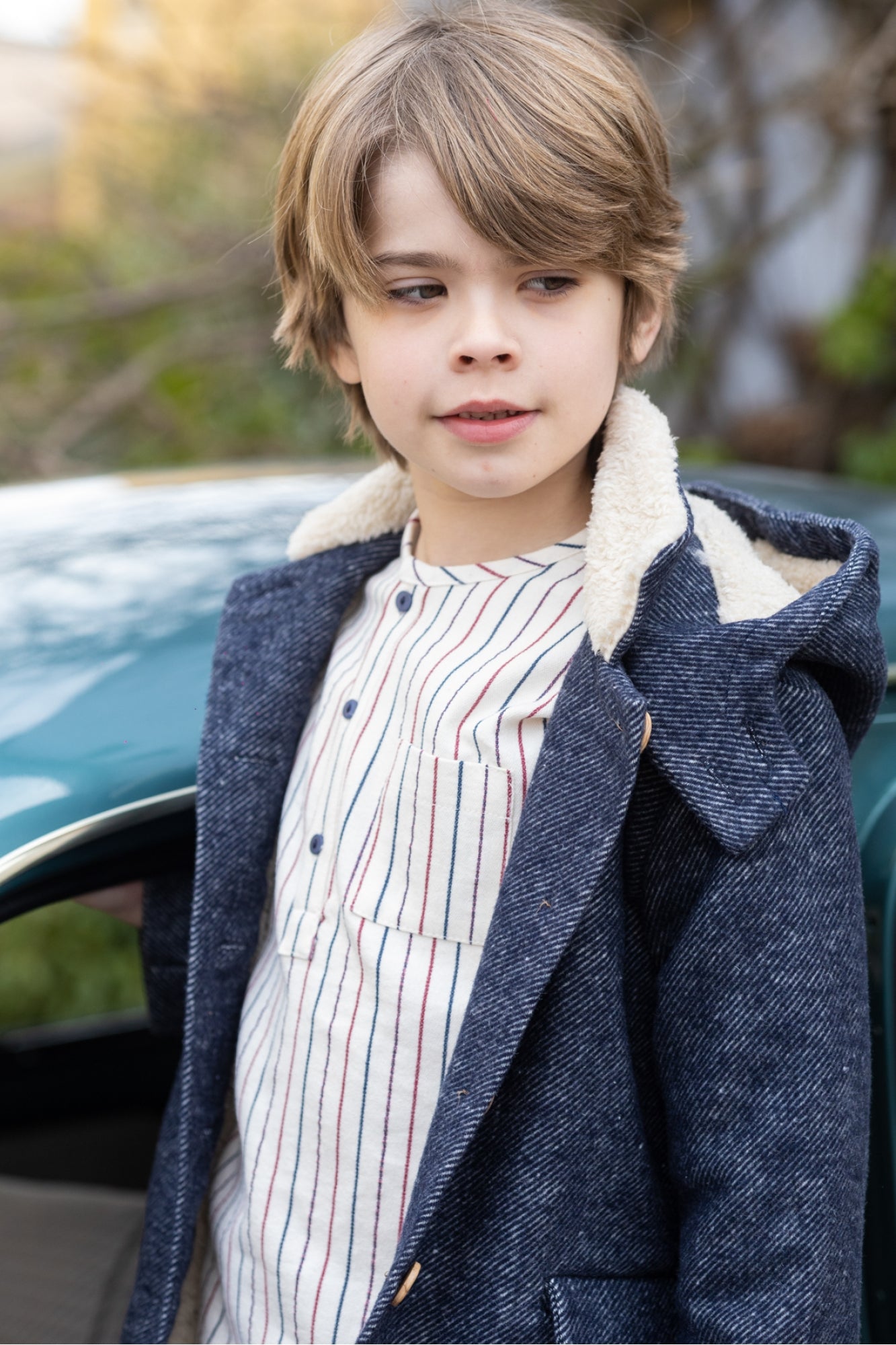 Camisa con cuello a la caja en tejido Raya British. Es unisex y lleva apertura de tres botones en la parte delantera para que sea más cómoda de quitar y poner.