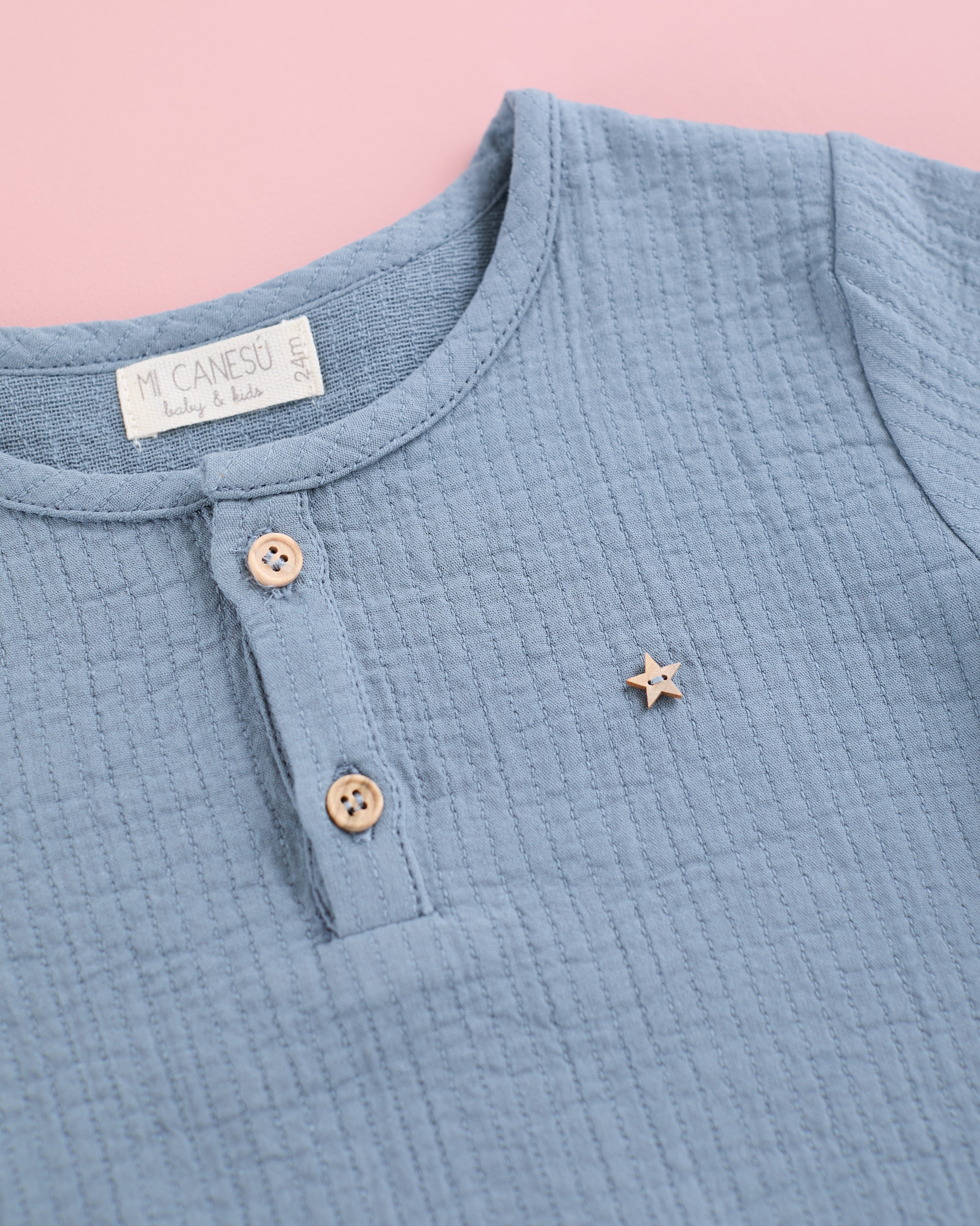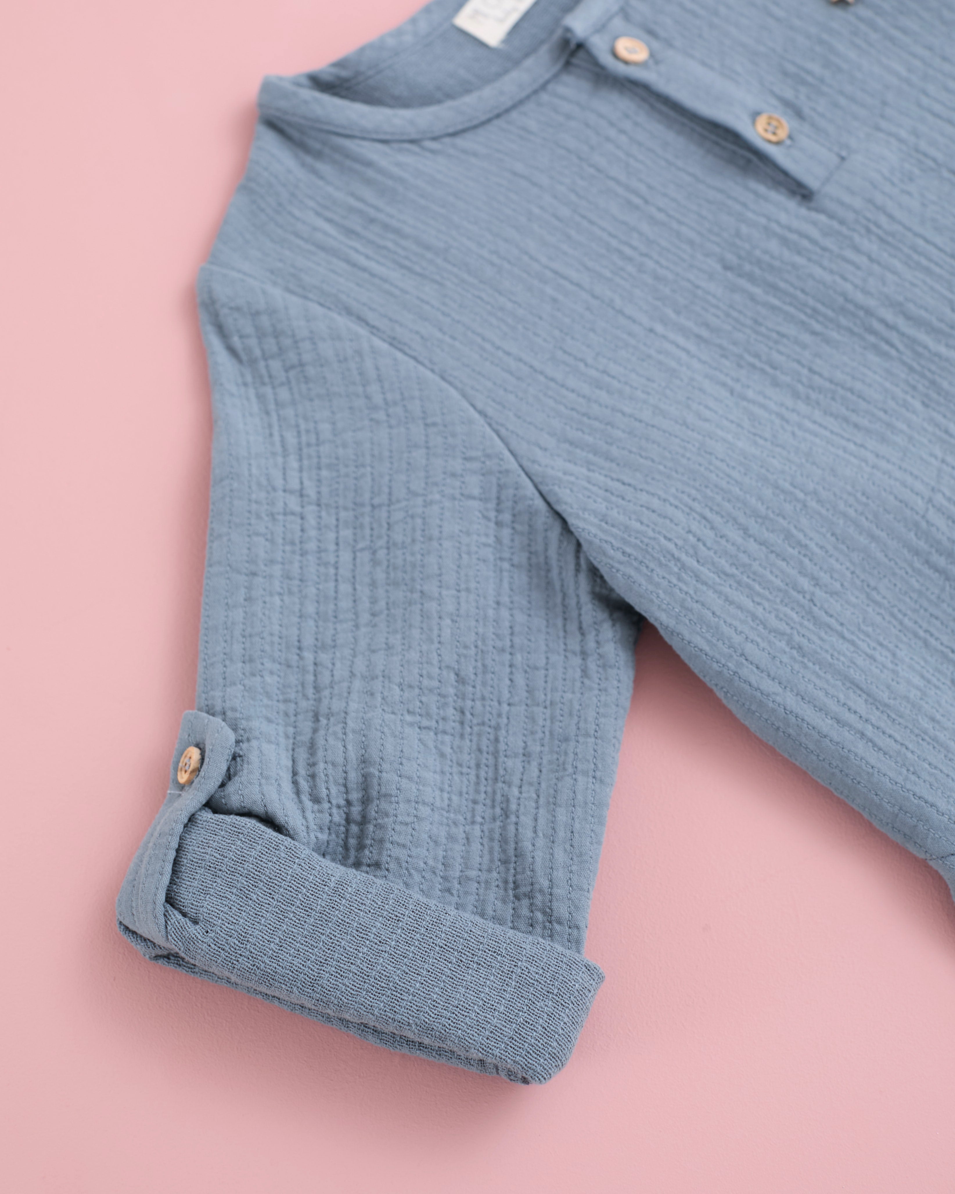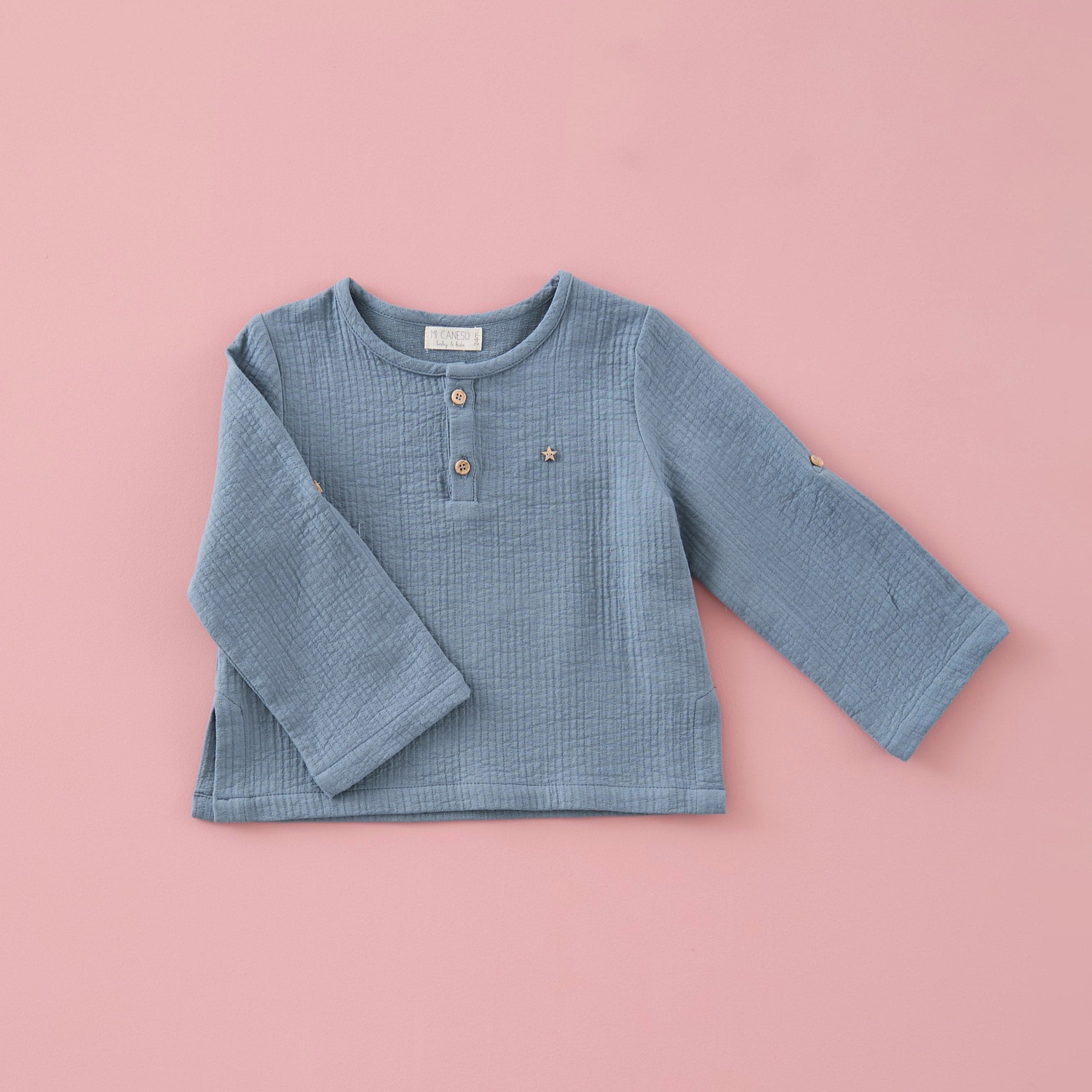 Camisa de niño en manga larga confeccionada con nuestro tejido Twin Plomo. Camisa con cuello a la caja y lleva dos botones de madera en la parte delantera. Ideal para el día a día y también perfecta para usar en ocasiones especiales coordinada con el resto de prendas de nuestra colección.
