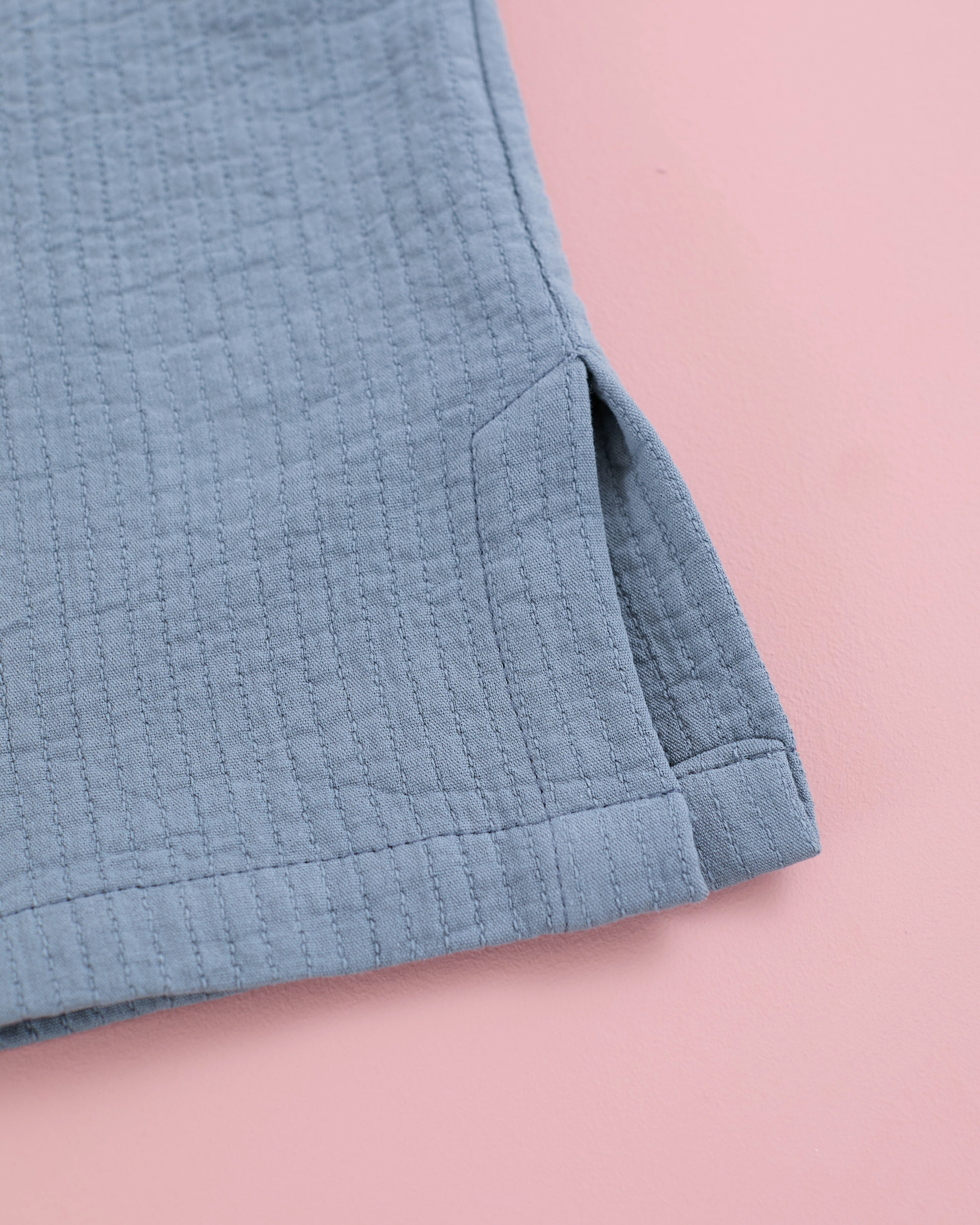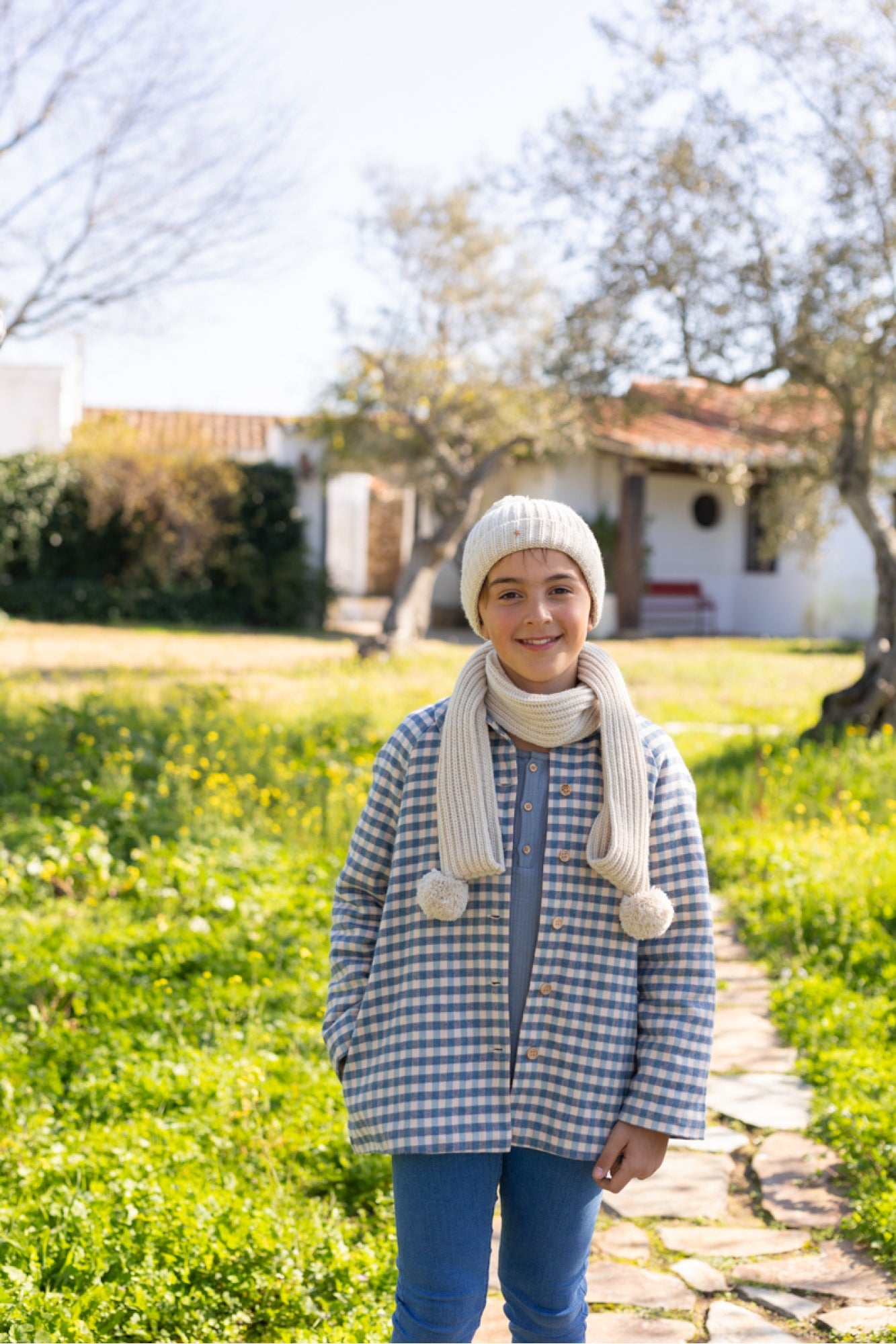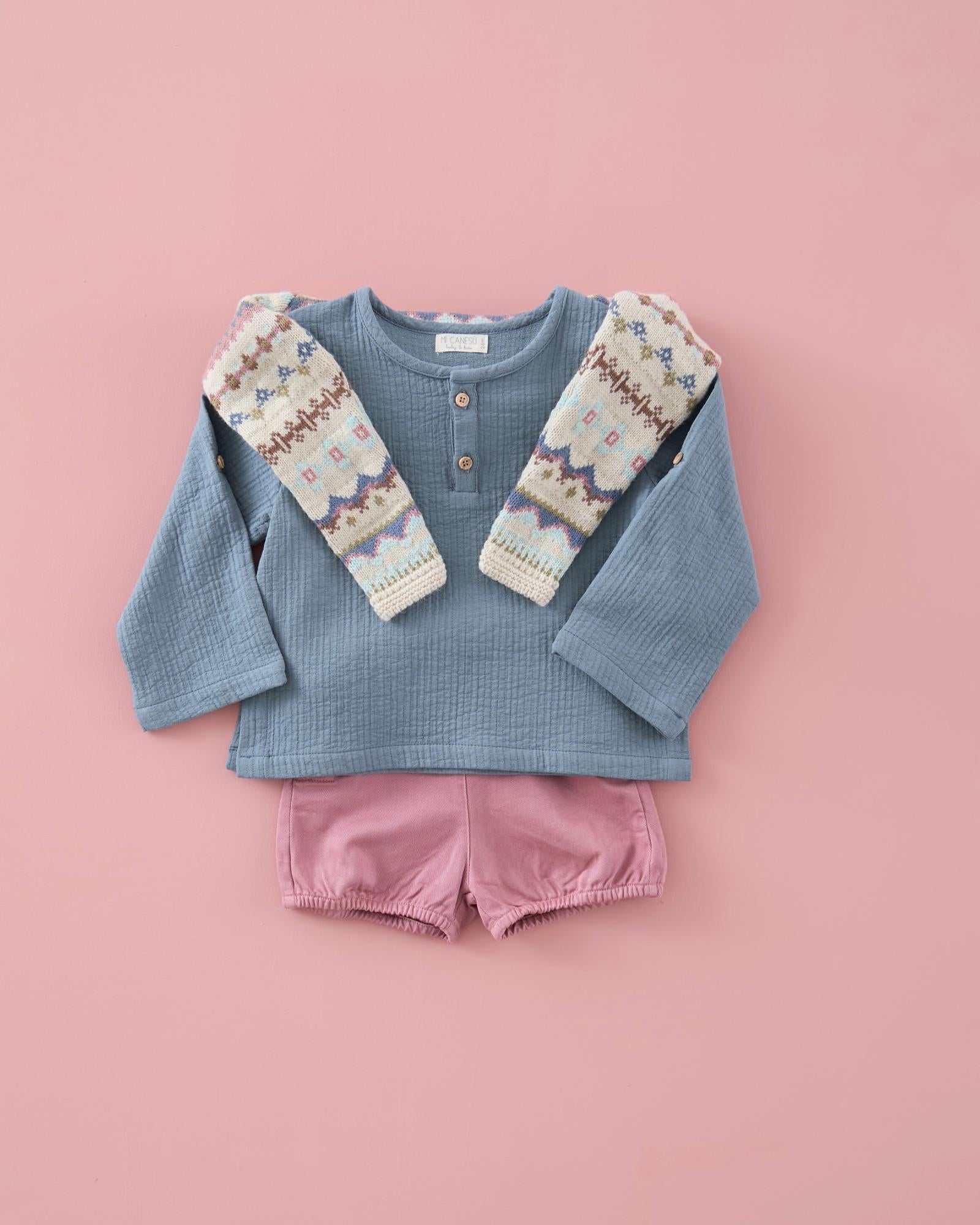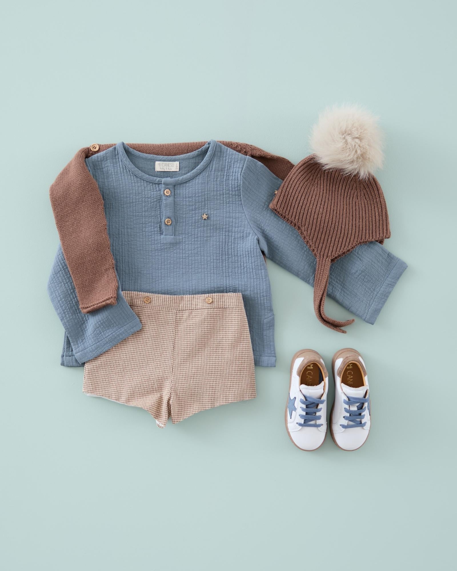 Camisa de niño en manga larga confeccionada con nuestro tejido Twin Plomo. Camisa con cuello a la caja y lleva dos botones de madera en la parte delantera. Ideal para el día a día y también perfecta para usar en ocasiones especiales coordinada con el resto de prendas de nuestra colección.