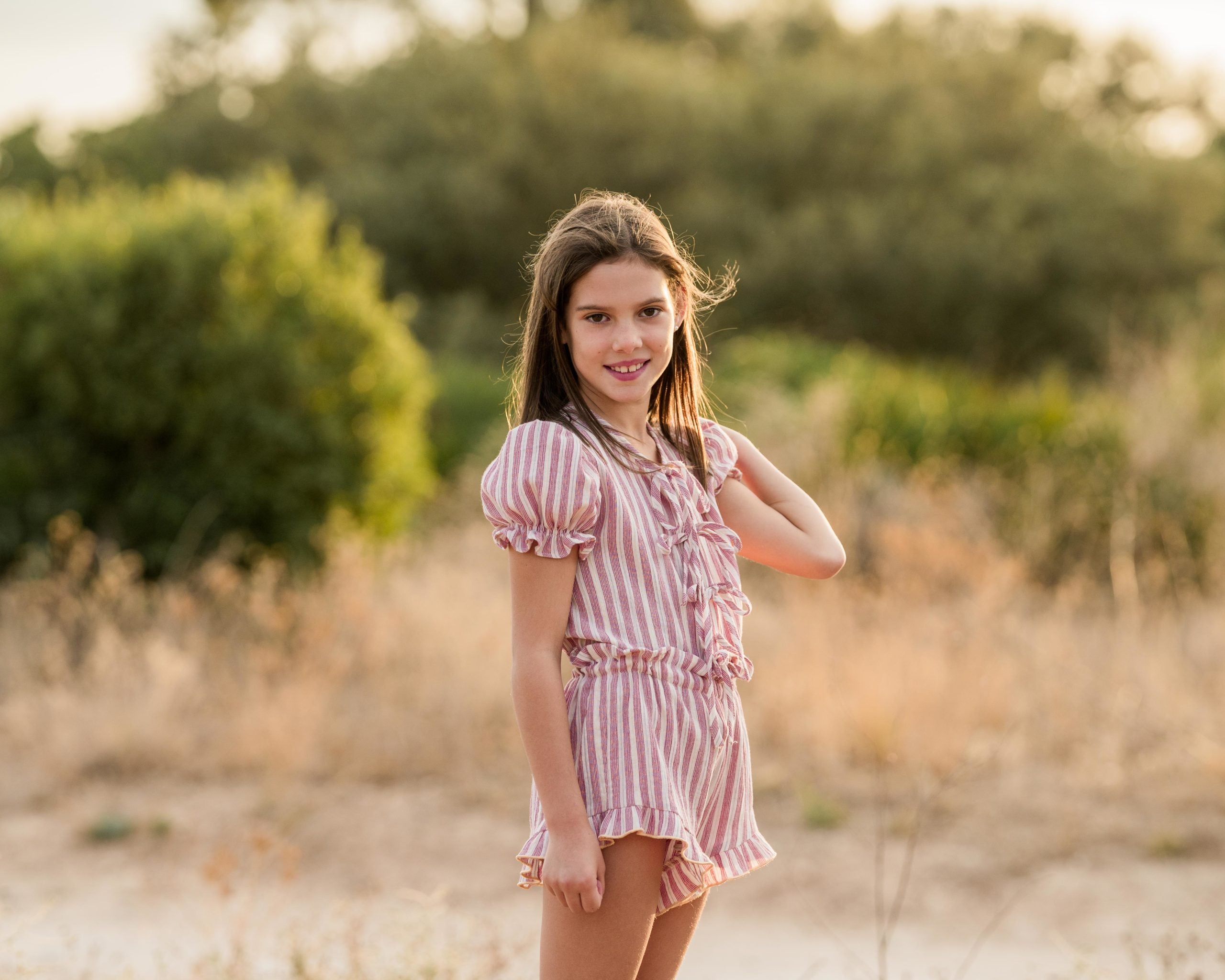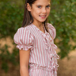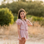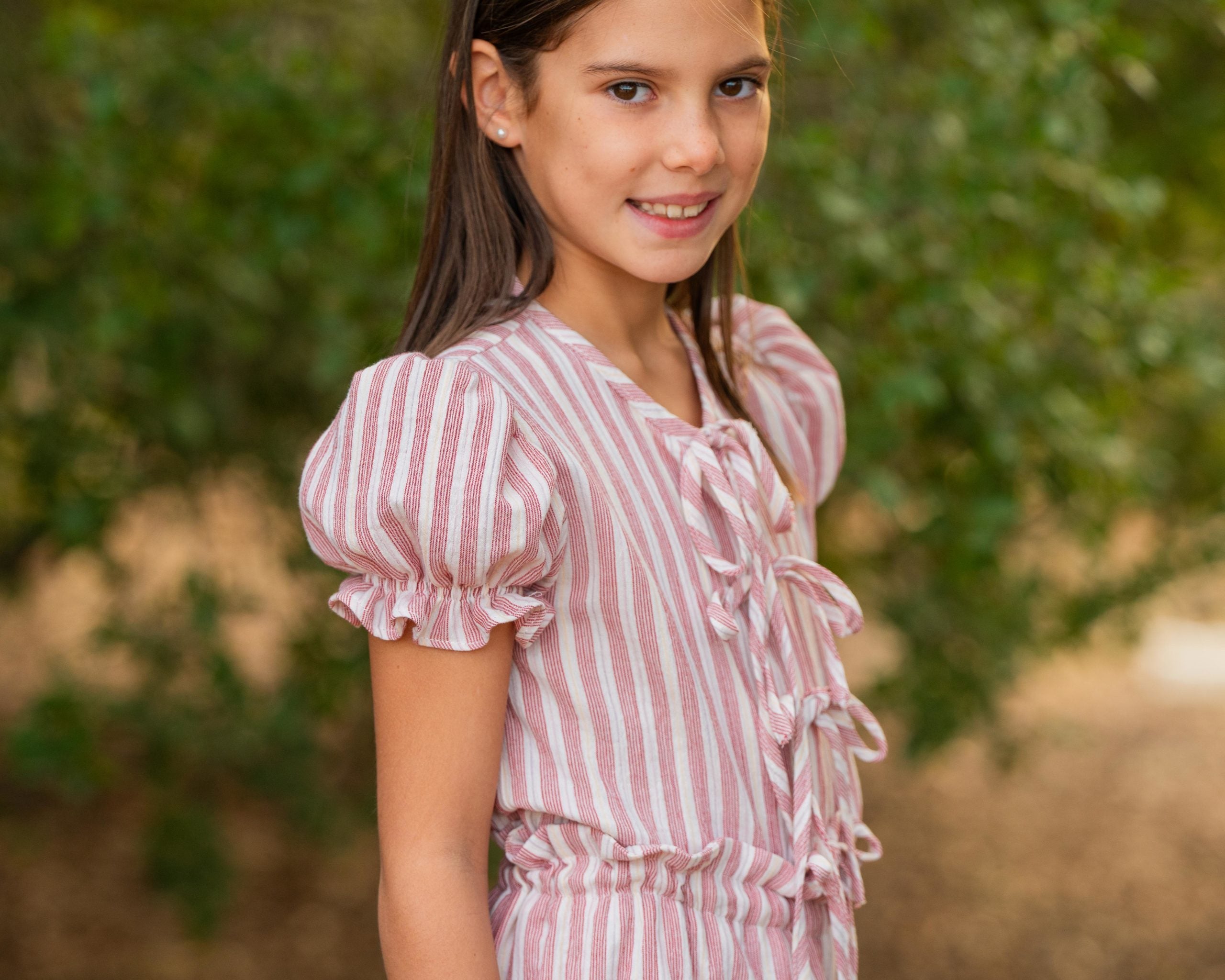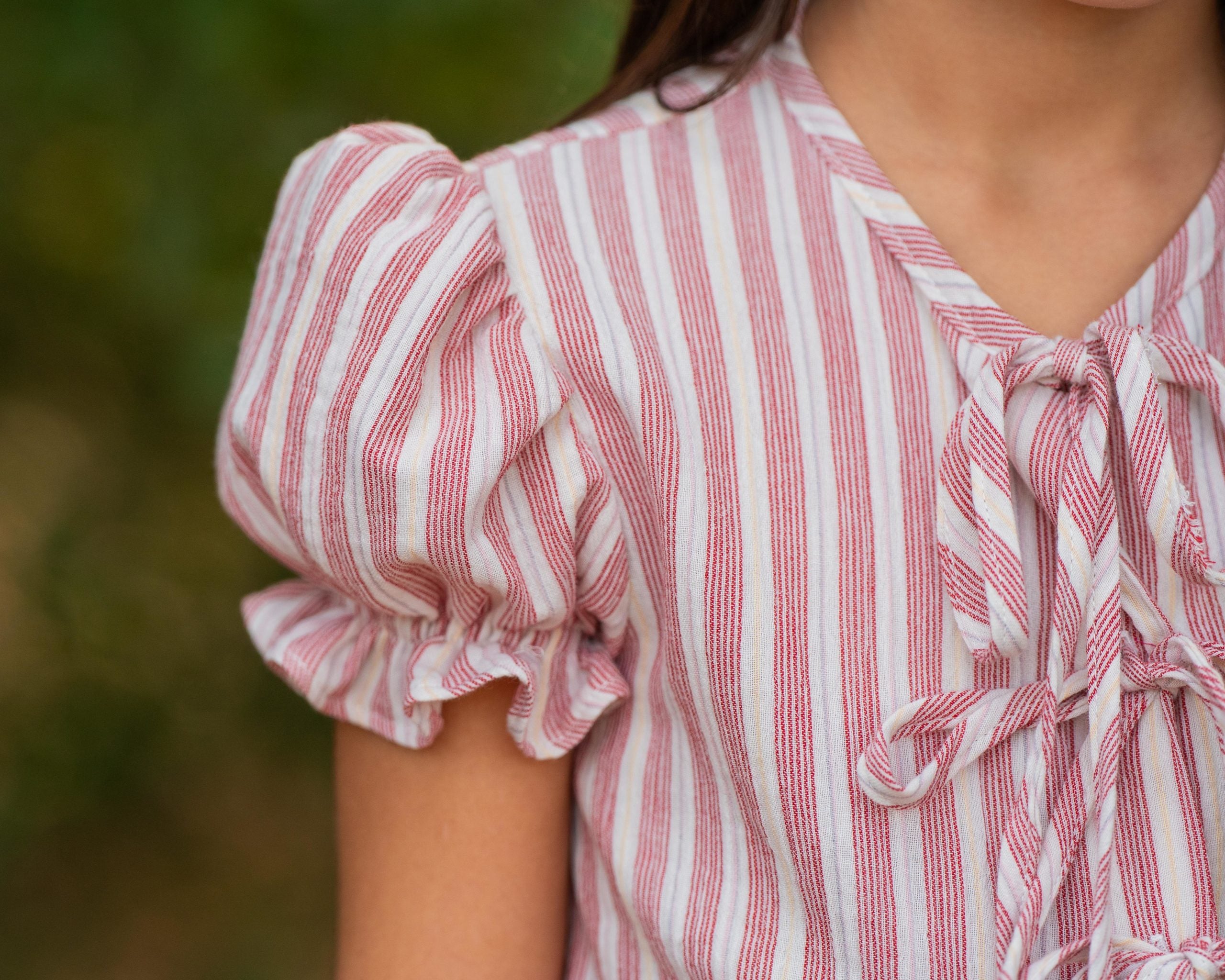 Camisa muy especial con terminaciones en lazo, estampado rayas rojas, azul, amarilla y rosa de doble gasa.