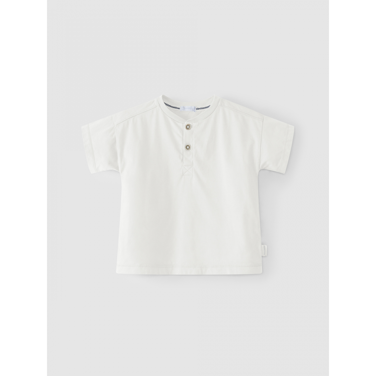 Camiseta de punto 100% algodón liso. Acabado en punto acanalado en el cuello, se abrocha con botones de madera en el pecho.