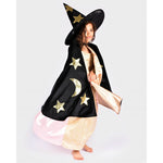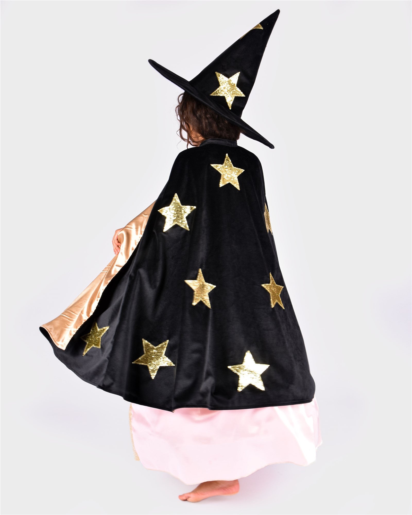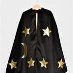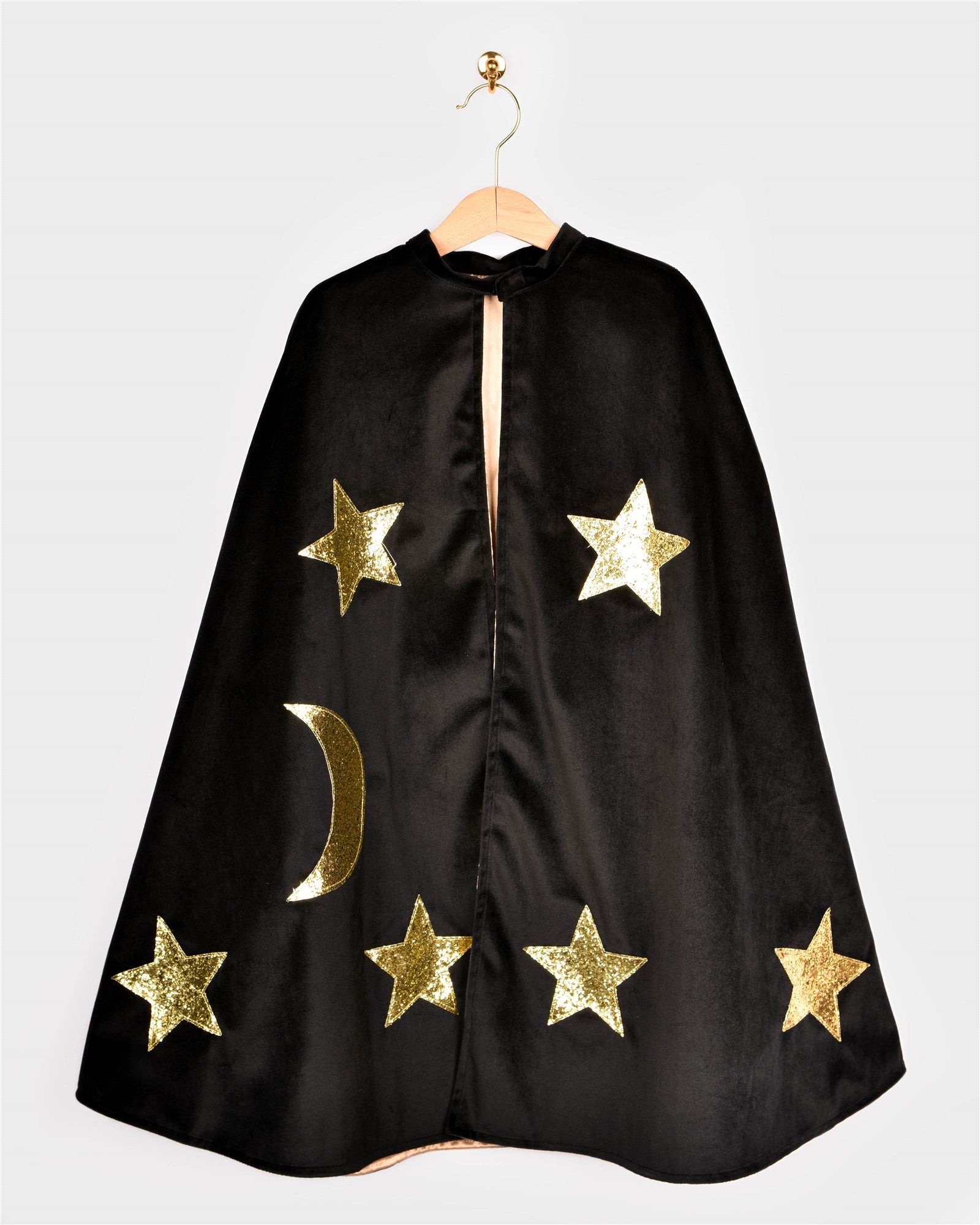Capa de terciopelo negro con estrellas doradas brillantes.