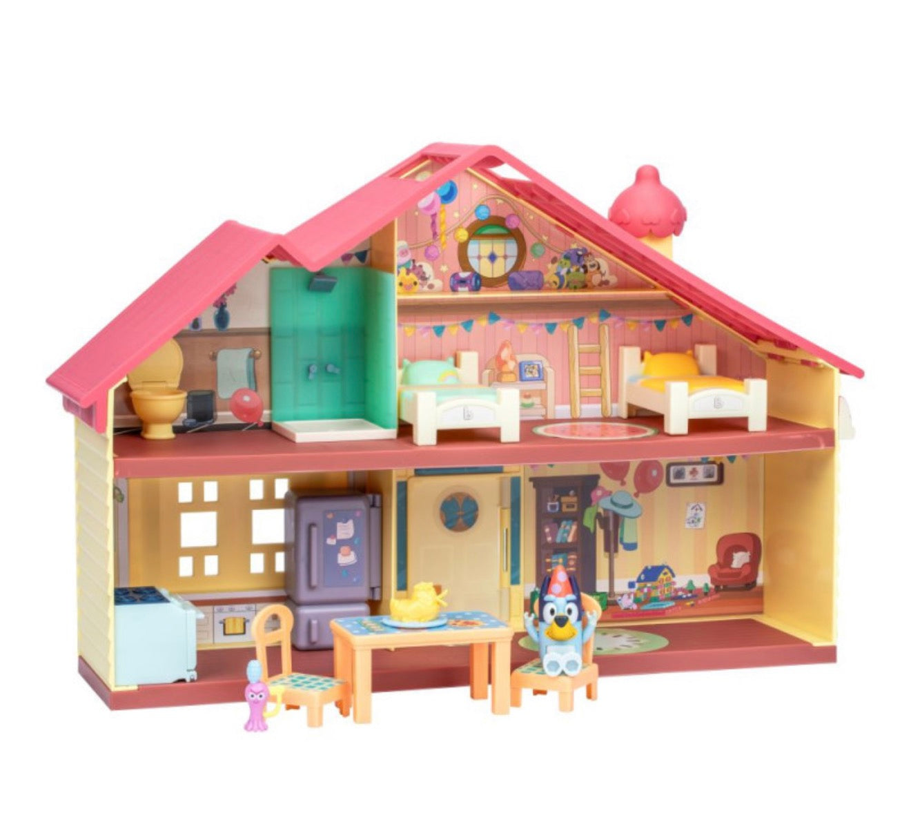 ¡Con cuatro habitaciones y dos plantas, en la Casa de celebraciones de Bluey hay un montón de espacio para que Bluey, su familia y sus amigos hagan celebraciones. ¡Y además han renovado el baño y la sala de estar! ¡La habitación es perfecta para hacer una fiesta del pijama! El set de juego trae 11piezas, ¡incluidas dos camas, una mesa de comedor con sillas, una nevera y un horno con un pastel muy especial en forma de pato! Decora la casa con la hoja de pegatinas antes de que lleguen los invitados. ¡El set de juego incluye una figura exclusiva de Bluey de 6,3 cm con un gorrito de cumpleaños puesto! La Casa de celebraciones de Bluey hasta tiene un asa incorporada para que te lleves la fiesta contigo.