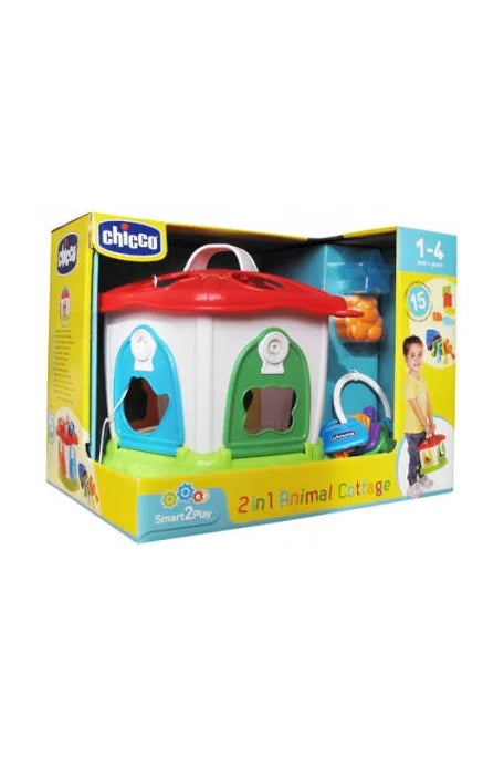 - Juguete de encajables: Casita con clasificación de formas 2 en 1. Inserta las 10 formas en la cabaña a través del agujero correcto y puedes volver a sacarlas abriendo las puertas con la llave correcta.