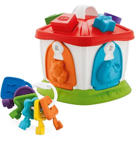 - Coordinación mano/ojos: Este juguete incluye 5 llaves para abrir y cerrar las puertas y poder sacar las formas insertadas dentro de la casita, aunque también podrá levantar el techo de la casa.