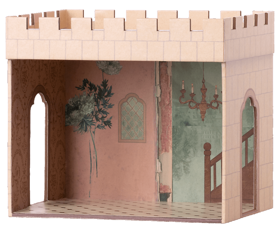 Este castillo es un precioso hogar para todos los ratones. Está hecho de cartón cubierto por impresiones únicas de Maileg. Úsalo como un pequeño hogar para tus ratones o como una sala de conexión para los dos castillos de Maileg.
