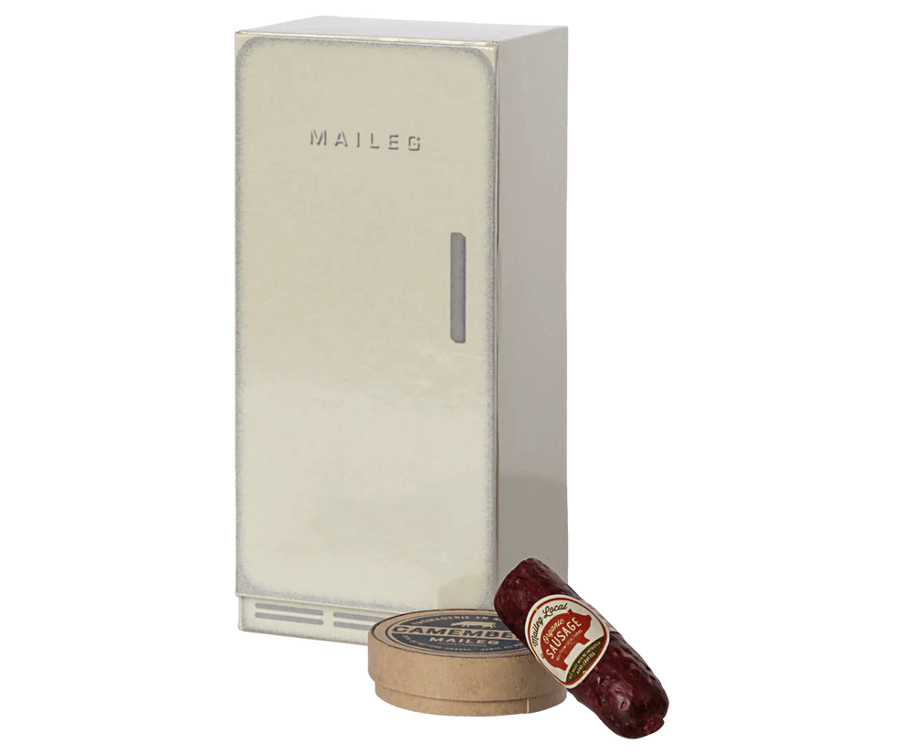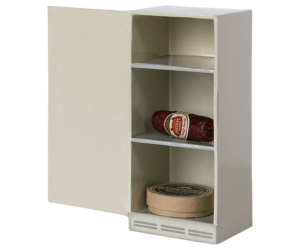 El lugar perfecto para guardar tus compras para que se mantengan frescas y frías. Dentro de la hielera, encuentras una pequeña salchicha y queso. La nevera está hecha de cartón y encaja perfectamente en el castillo del ratón.
